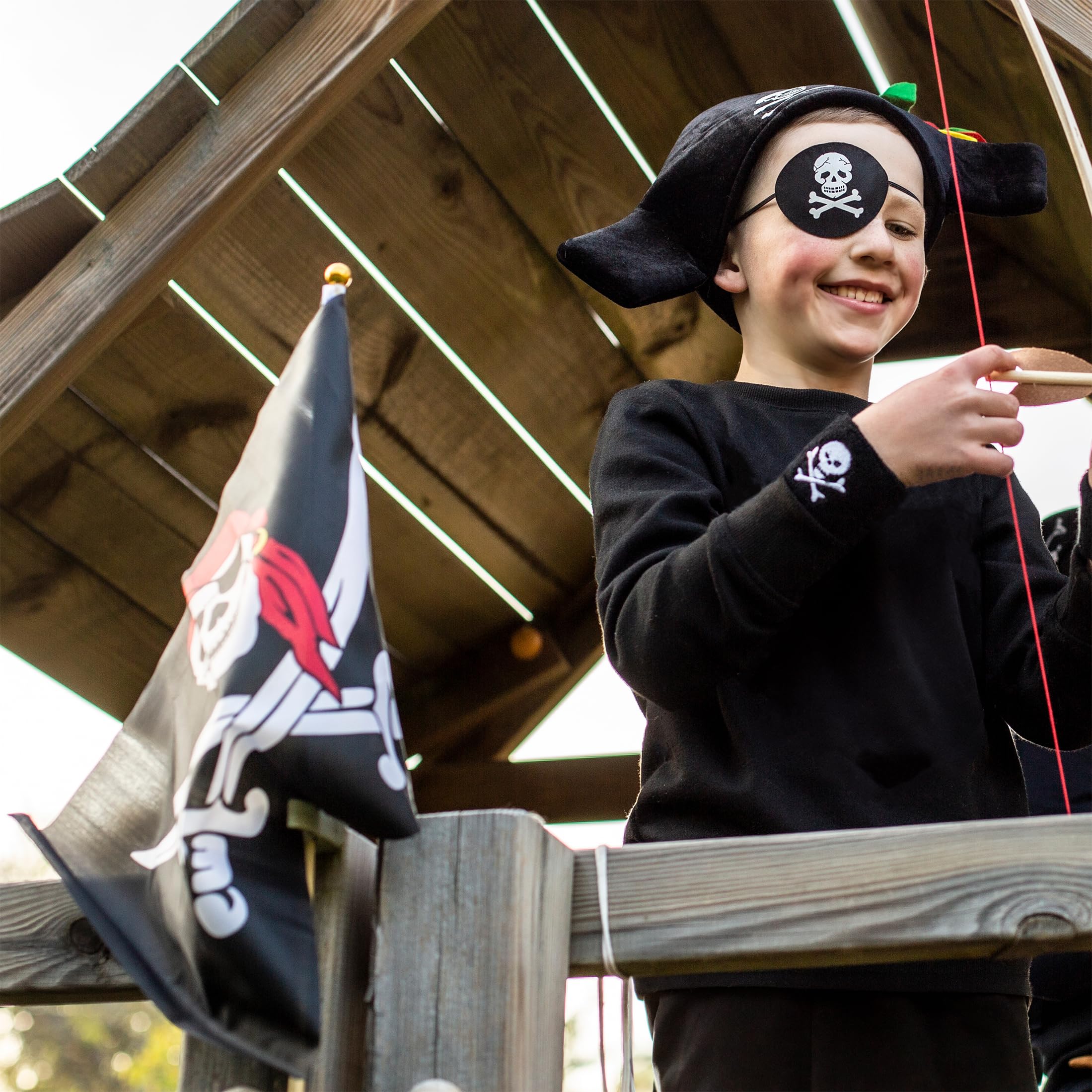 Ahoi ihr Landratten! Mit dieser coolen Piratenflagge verwandelt sich euer Garten im Nu in die Karibik! Der gruselige Totenkopf lässt jedes Spielhaus oder Klettergerüst zum echten Piratenschiff werden. Die Kids werden total begeistert sein und stundenlang Pirat spielen. Die Flagge ist 42x30cm groß, wetterfest und hält auch bei Regen problemlos durch. Mit dem praktischen Kunststoffstab könnt ihr sie ganz einfach überall befestigen - ob am Baumhaus, Schaukelgerüst oder am Zaun. Perfekt für Geburtstage, Gartenpartys oder einfach so als tägliches Abenteuer. Macht eure kleinen Piraten zu Kapitänen und lasst die Flagge hissen! Die Qualität ist top und die Farben bleiben lange schön. Einfach ein Muss für alle Piraten-Fans!
