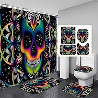Bring Farbe in dein Badezimmer! Dieses coole 4-teilige Set mit bunten Totenkopf-Muster besteht aus: Duschvorhang (180x180cm), Badematte (45x75cm), O-förmigem WC-Bezug (38x42cm) und U-Teppich (37,5x45cm). Alles aus hochwertigem Polyester und weichem Flanell - wasserdicht, rutschfest und langlebig. Mit 12 gratis Haken einfach zu installieren. Das hochauflösende Druckdesign verblasst nicht und bringt Lebensfreude ins Bad. Perfekt für Haus, Hotel oder Wohnheim. Einfach in der Maschine waschbar (kalt) und zum Trocknen aufhängen. Mach dein Badezimmer zum echten Hingucker!