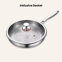 Kochen ohne Chemie - mit dieser unbeschichteten Titan-Pfanne! Die 26cm Tovara Titanium Pro Pfanne hat eine natürliche Antihaft-Oberfläche durch das spezielle Hammered-Design. Fünflagiger Druckguss sorgt für gleichmäßige Hitzeverteilung, nichts brennt mehr an! Perfekt für Induktion, Gas, Ceran und alle anderen Herdarten. Inklusive Glasdeckel zum Schmoren und Dünsten. Die Pfanne ist super kratzfest, spülmaschinengeeignet und hält ewig. Mitgeliefert werden Schwamm, Suppenlöffel und Spatel - alles was du zum Kochen brauchst. Großes Fassungsvermögen für die ganze Familie. Endlich gesund kochen ohne teflonbeschichtete Pfannen! Ob Steak braten, Gemüse anbraten oder Eierspeise - alles gelingt perfekt. Ein Küchenhighlight für alle, die Wert auf Qualität und Gesundheit legen.