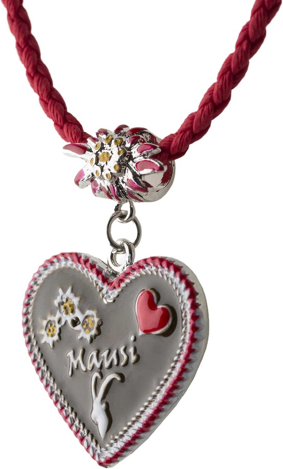 Für die nächste Wiesn oder Trachtenparty - diese Trachtenkette mit elegantem Herz-Anhänger ist einfach wunderschön! Das antik-silberfarbene Herz ist mit acht kleinen und einem großen Strassstein besetzt, dazu kommt ein niedliches Edelweiss. Die Kette selbst ist aus angenehmer Kordel und Satinband - liegt super angenehm am Hals und unterstreicht den echten Trachtencharakter. Mit 42 cm Länge plus 8 cm Verlängerung kannst du die Länge individuell anpassen. Der Karabiner-Verschluss ist praktisch und sicher. Verfügbar in vielen Farben - Rot, Blau, Weiß, Rosa, Lila, und mehr - da findest du sicher die passende Farbe zu deinem Dirndl oder deiner Lederhose. Perfekt für Oktoberfest, Canstatter Wasen oder andere Trachtenfeste. Einfach fesch!