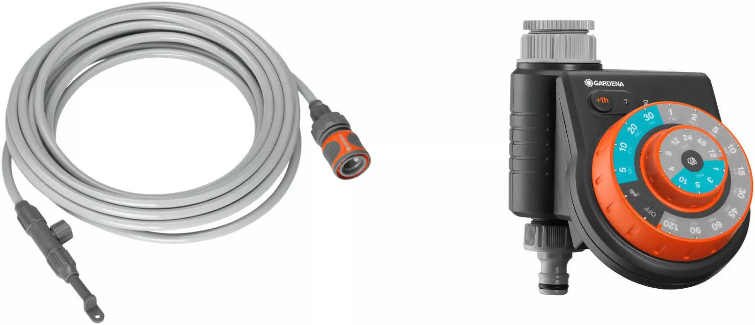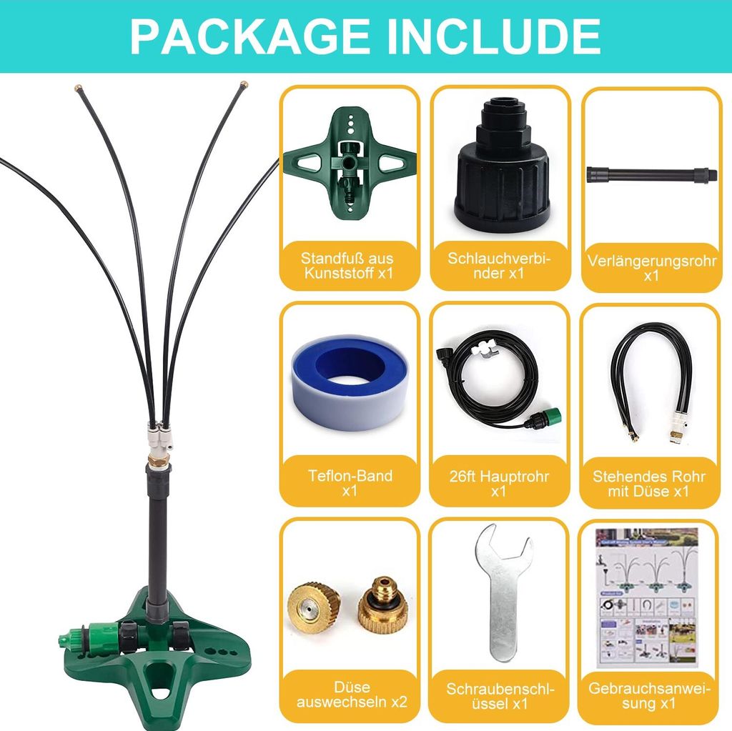 Einfach an den Gartenschlauch oder eine Zeitschaltuhr anschließen und schon geht's los! Perfekt für die Gartenbewässerung, zur Terrassenkühlung, für den Schirmbereich oder die Poolumgebung.