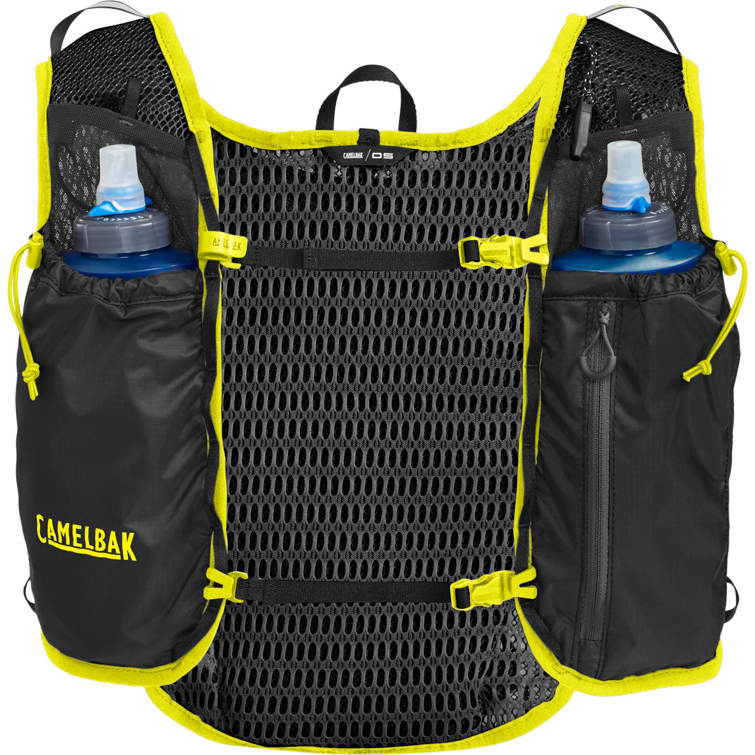 Hey Läuferinnen! Dieser CamelBak Hydration Vest ist genau das, was du für lange Trail-Runs brauchst. Mit nur 964g super leicht, aber trotzdem mit allem ausgestattet, was du unterwegs benötigst.\n\nDas 3D Micro Mesh sorgt für maximale Belüftung - kein schwitziger Rücken mehr! Der Trinkschlauch wird sicher durch den Tube Trap gehalten, sodass er nicht hin und her flattert. Und die doppelt verstellbaren Brustgurte geben dir den perfekten Sitz, egal ob du bergauf oder bergab läufst.\n\nBesonders praktisch: Die sichere Handytasche mit Reißverschluss. So hast du dein Smartphone immer griffbereit, ohne dass es rausfällt. Und für frühe Morgen- oder Abendläufe sind reflektierende Elemente dabei - sicherer unterwegs!\n\nPerfekt für alle, die lange Strecken laufen und nicht ständig wegen Trinkpausen anhalten wollen. Einfach Wasser rein, Vesper in die Taschen und los geht's! Ob Trailrunning, Wanderungen oder lange Trainingseinheiten - mit diesem Vest bist du bestens ausgerüstet.