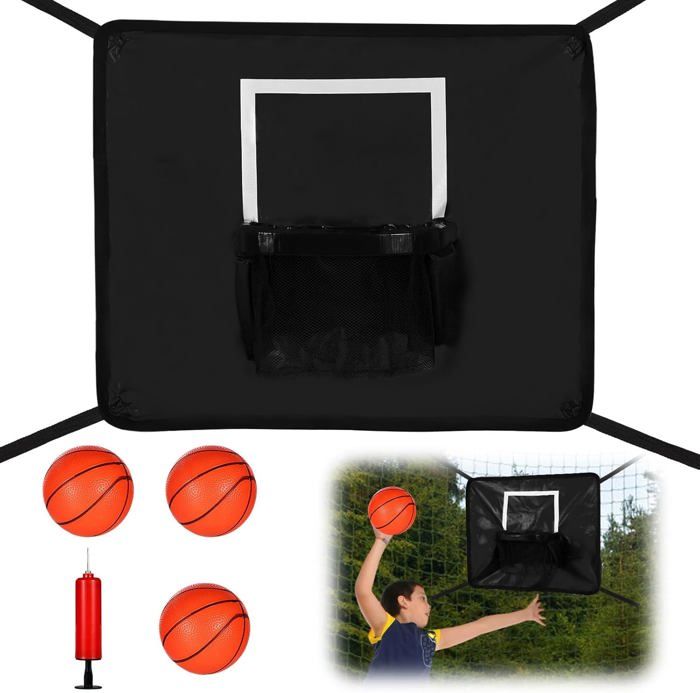 Wie cool ist das denn? Dieser Trampolin-Basketballkorb von lasuroa bringt noch mehr Spaß aufs Sprungtuch! Im Set enthalten: 1 Basketballständer, 1 Korb mit 4 Verbindungsseilen (je 170 cm lang), 3 Mini-Basketbälle die im Dunkeln leuchten und 1 praktische Pumpe. Das Rückbrett und der Reifen sind aus wasserdichtem PVC und Perlbaumwolle - atmungsaktiv, weich und perfekt für stundenlangen Spielspaß. Die Montage ist super einfach, ohne Werkzeug - einfach die Seile an der Polkappe des Trampolinzauns befestigen. Passt für alle Trampolingrößen und ist für alle Altersgruppen geeignet. Das stabile Design mit 4 Aufhängeseilen sorgt dafür, dass auch bei windigem Wetter alles sicher an Ort und Stelle bleibt. So wird Hüpfen zum Basketball-Abenteuer! Einfach aufbauen, Bälle aufpumpen und losspringen - wer macht den coolsten Dunk?