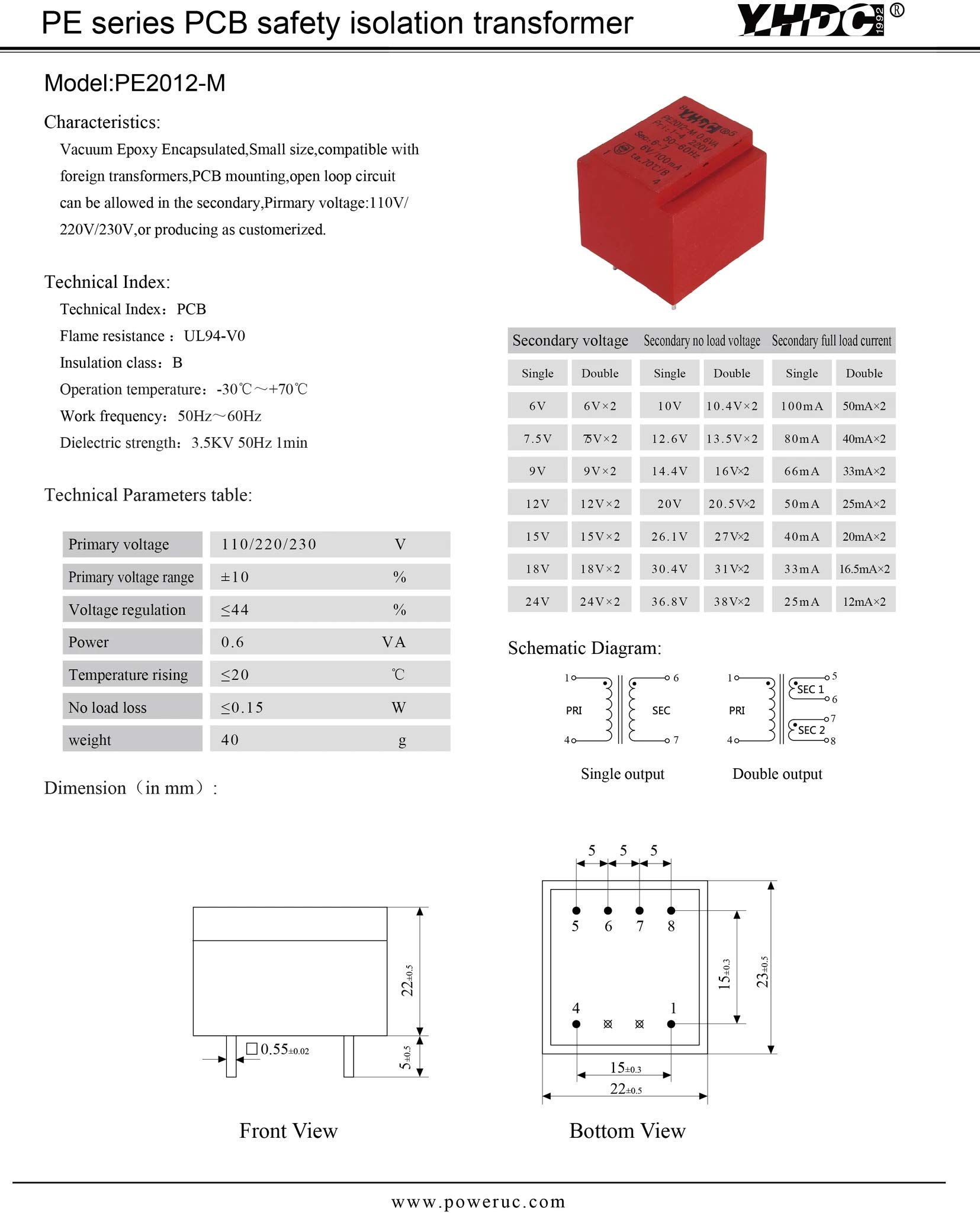 YHDC PE2012-M Isolations Transformator 0,6VA 220V/24V - PCB Löt Transformator