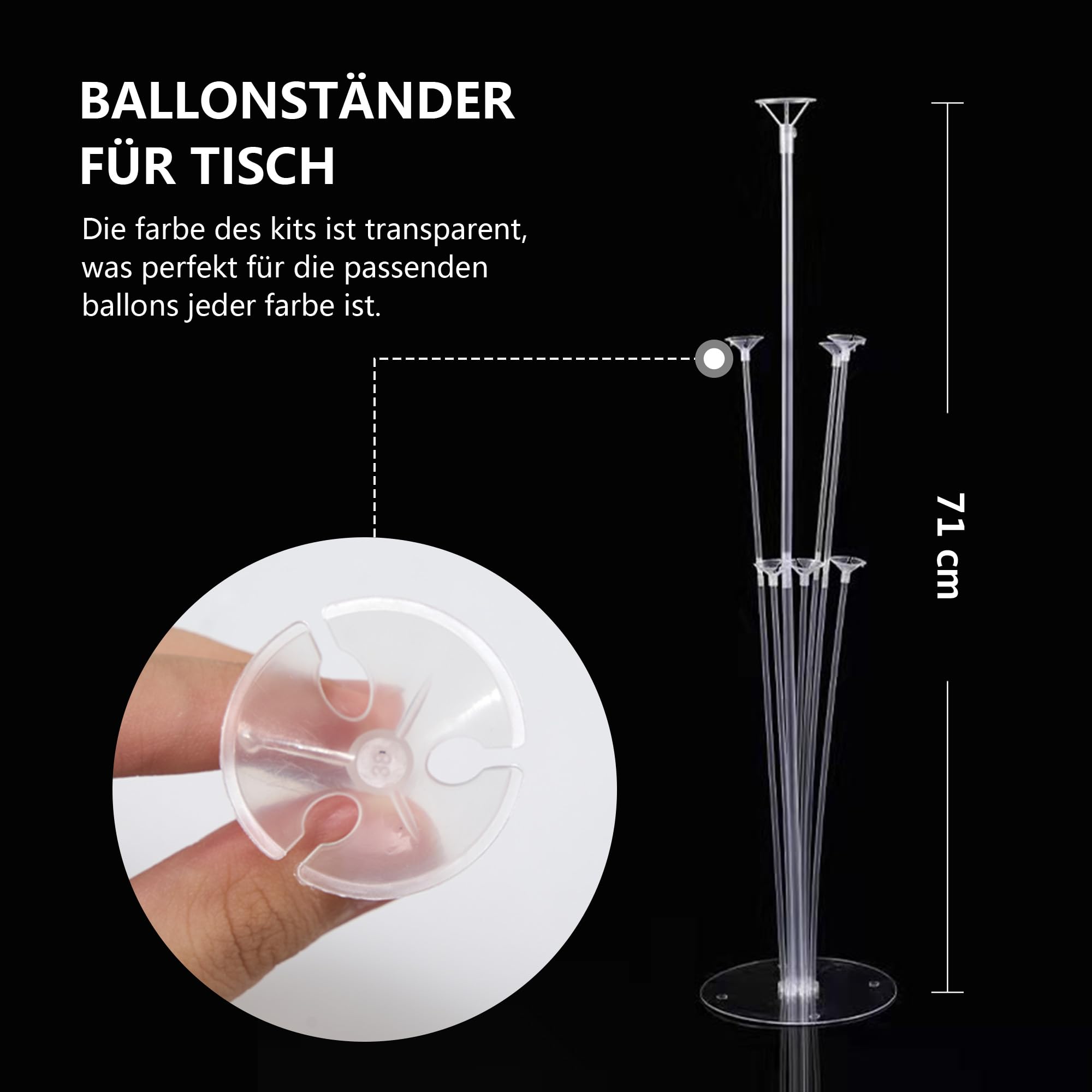 Party geplant? Mit diesen transparenten Ballonständern wird deine Dekoration zum Hit! Das Set enthält 6 komplette Ständer mit je 70cm Höhe. Die durchsichtigen Stäbe und Halterungen sind kaum sichtbar - die Ballons scheinen zu schweben! Einfach die Ballons aufblasen, in die Halterung stecken und fertig ist die Dekoration. Die runden Acryl-Basen stehen stabil auf jedem Untergrund. Mit 8x34cm und 3x20cm Stäben pro Set kannst du tolle Höhenunterschiede gestalten. Perfekt für Geburtstage, Hochzeiten, Babypartys oder Firmenevents. Ob als Ballonsäulen, Ballon-Bogen oder einzeln verteilt - deiner Kreativität sind keine Grenzen gesetzt. Wiederverwendbar und einfach zu lagern. Kein lästiges Kleben mehr - einfach die Halterungen nutzen und die Ballons bleiben genau da, wo du sie haben willst!