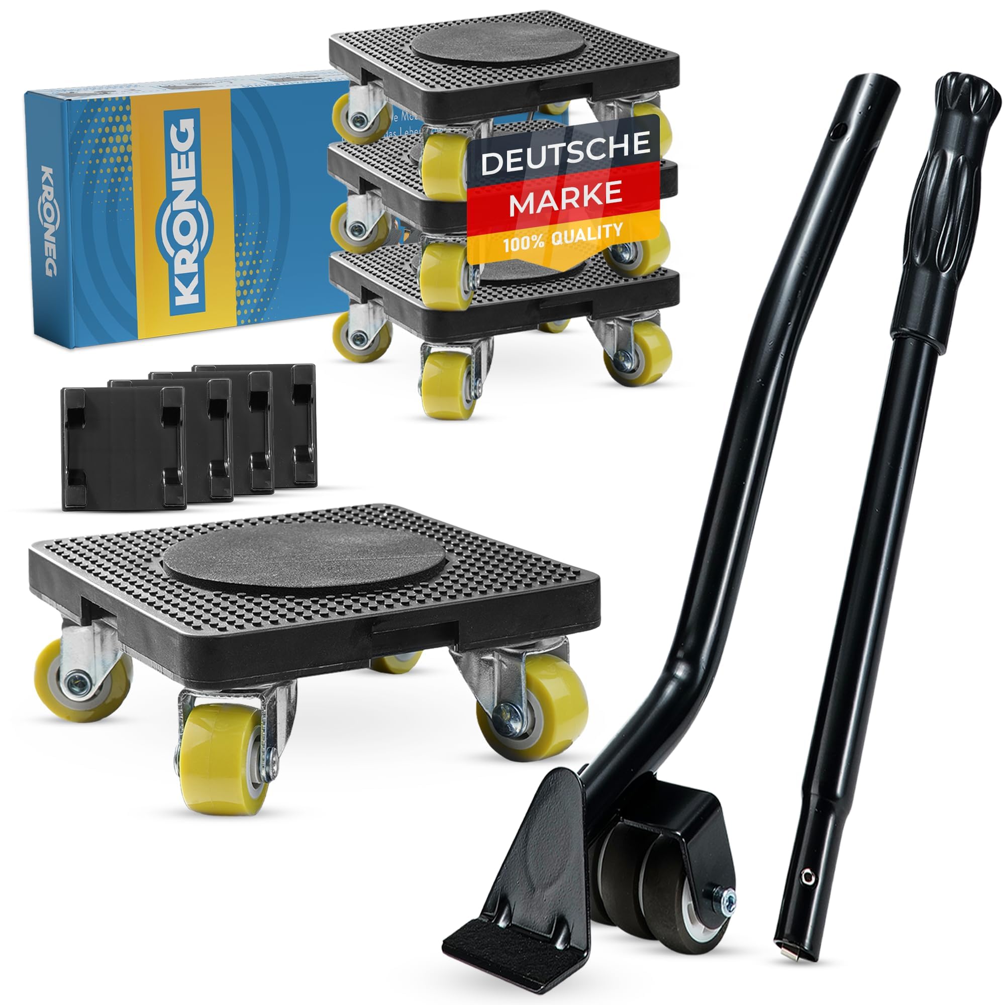 Kennst du das? Du willst mal wieder umräumen oder den Schrank verschieben, aber das Ding ist einfach viel zu schwer? Mit diesem Möbel Transportrollen Set wird das zum Kinderspiel! Das Set besteht aus nem cleveren Hebel (55 cm lang) und 4 Transportrollen, die jeweils 11x11x6 cm messen. Zusammen halten die bis zu 500 kg aus - also selbst dein schwerster Schrank ist kein Problem. Die Rollen sind aus robustem Stahl und drehen sich 360 Grad, du musst also keine Möbel anheben um die Richtung zu ändern. Die kugelgelagerten Räder sind super leise und schonen deine Böden. Montage? Total einfach! Einfach den Hebel unter das Möbelstück schieben, runterdrücken, die Rollen reinsetzen - fertig! Kein Werkzeug nötig. Im Lieferumfang sind neben Hebel und Rollen auch noch rutschfeste Unterlagen dabei. Egal ob für Schränke, Kommoden, Waschmaschinen oder andere schwere Teile - damit machst du dir das Leben echt leichter!