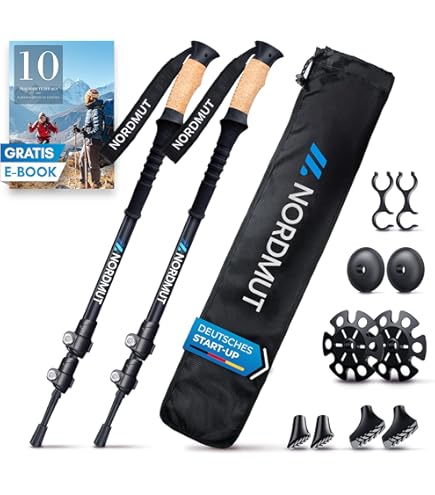 Bergfreunde, diese Trekkingstöcke werden euch begeistern! Aus echter 3K-Carbonfaser - dem Material aus der Luft- und Raumfahrt - wiegen sie nur 170 Gramm pro Stock. Das spart enorm Energie auf langen Touren.\n\nVerstellbar von 65-135 cm passen sie sich jeder Körpergröße und jedem Gelände an. Der ergonomische Griff liegt auch bei Nässe sicher in der Hand und absorbiert Schweiß.\n\nIm Lieferumfang ist alles dabei, was du brauchst: Wolframstahl-Spitze für Asphalt, Gummipuffer für steinige Wege und Schlammteller für Matsch und Schnee. So bist du für jede Jahreszeit gerüstet.\n\nCarbon ist nicht nur ultraleicht, sondern auch vibrationsarm und bruchsicher - perfekt für anspruchsvolle Bergtouren. Und weil die Stöcke so langlebig sind, schonst du auch noch die Umwelt. Nachhaltig wandern mit Top-Performance!\n\nEgal ob gemütliche Wanderung oder anspruchsvolle Bergtour - mit diesen Stöcken machst du nichts falsch. Einfach ausprobieren und den Unterschied spüren!