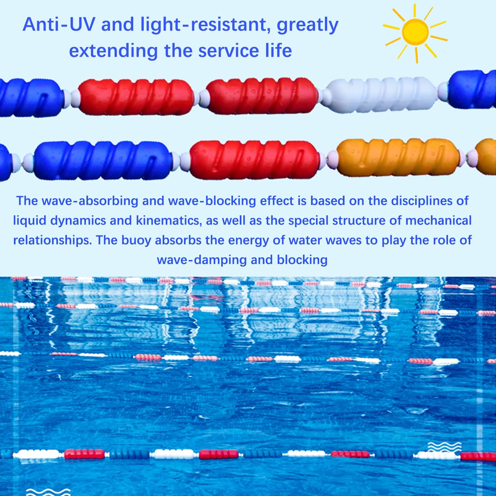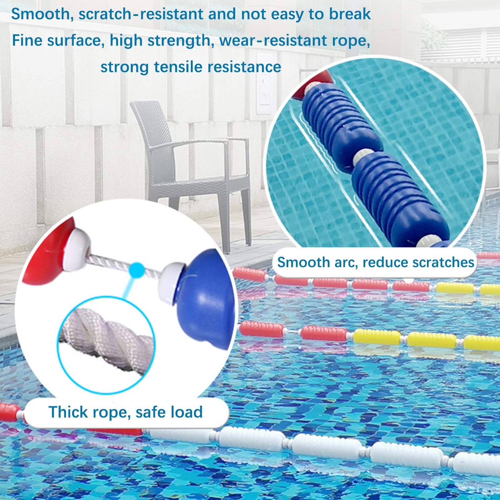 Mach deinen Pool oder Strandbereich sicherer! Diese 15m lange Schwimmbahn-Trennleine unterteilt Bereiche klar und deutlich. Mit 6cm dicken Bojen aus robustem Polyethylen, die super Auftrieb haben und UV-beständig sind. Perfekt für Schwimmbäder, Wasserparks, Strände oder private Pools. Die leuchtenden Farben sind gut sichtbar, die Oberfläche glatt und kratzfrei. Einfach auslegen und schon sind Bahnen getrennt oder Gefahrenbereiche markiert. Praktisch für Training, Wettkampf oder einfach mehr Sicherheit im Wasser.