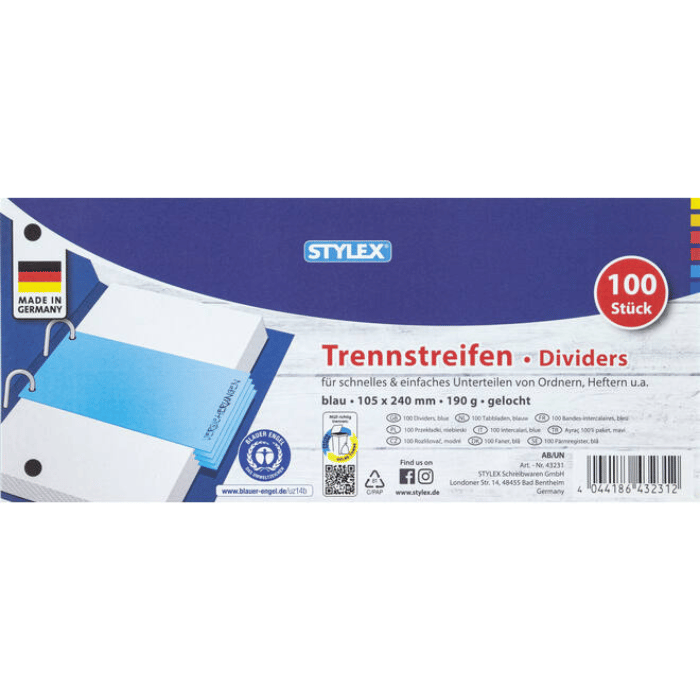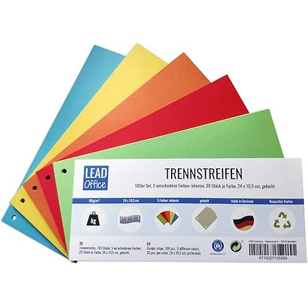 Diese blauen Trennstreifen von 5 Star sind super praktisch für Büro, Lager oder Werkstatt! Im Format 240x105mm - perfekt für Akten, Ordner oder zur Kennzeichnung. Aus stabilem RC-Karton mit 170g/m² Grammatur - reißfest und langlebig. Mit 2-fach Lochung an der Schmalseite - einfach in Ordner oder Ringbücher einzuhängen. Die kräftige blaue Farbe sorgt für gute Sichtbarkeit und Übersicht. Packung mit 100 Stück - lange Vorrat. Ideal zum Sortieren von Dokumenten, als Markierung oder für die Lagerorganisation. Einfach zu beschriften mit Kugelschreiber oder Marker. Mach deine Ablage professioneller und übersichtlicher - mit diesen qualitativ hochwertigen Trennstreifen. Bestelle jetzt und bring Ordnung in deine Unterlagen!