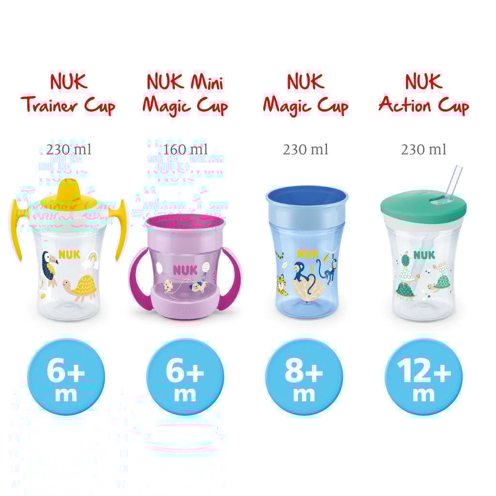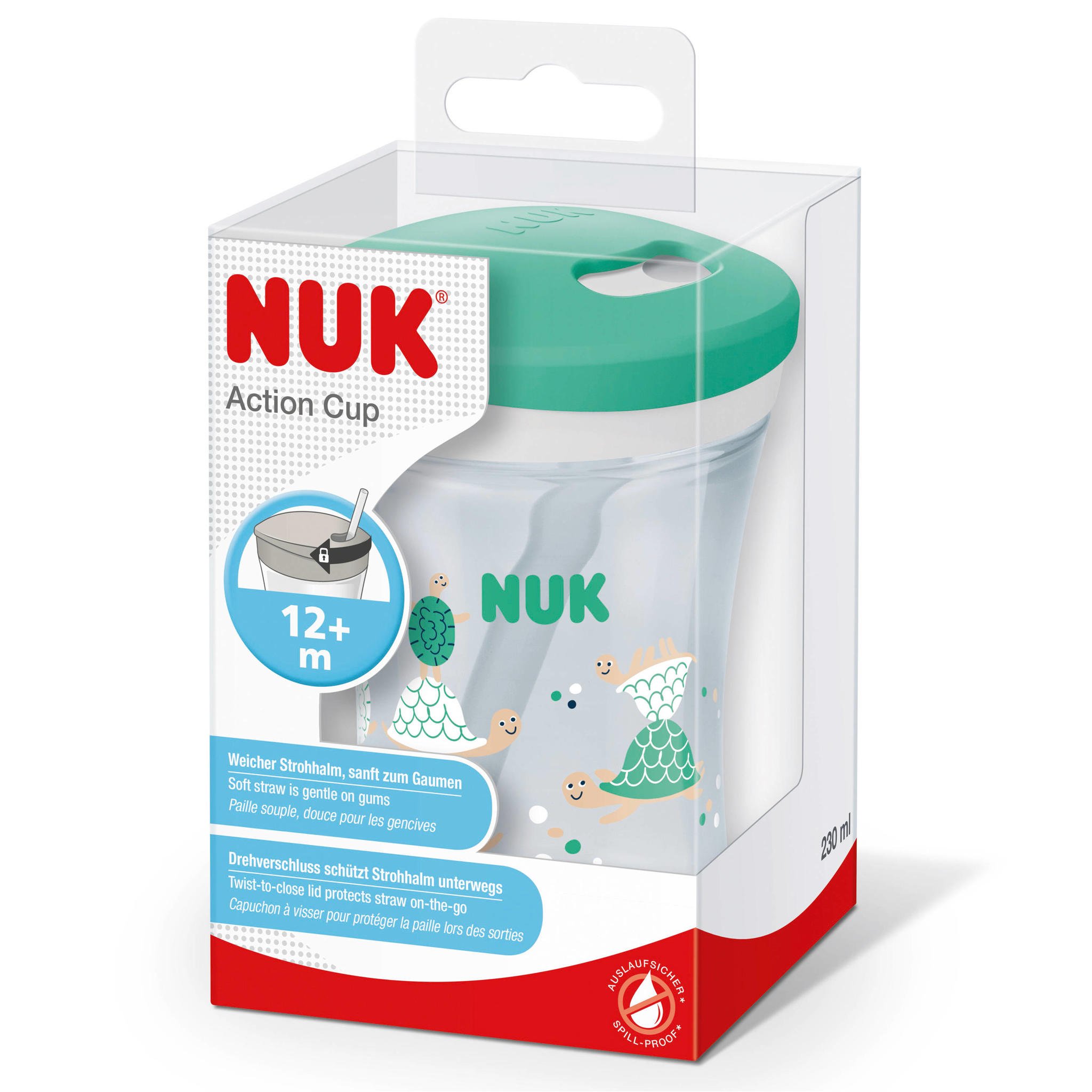 Der NUK Action Cup ist der perfekte Begleiter für dein aktives Kind ab 12 Monaten! Mit 230ml Fassungsvermögen und weichem Trinkhalm, der sanft zu Gaumen und Zahnfleisch ist. Der praktische Drehverschluss versteckt den Halme unterwegs - alles bleibt sauber und trocken. Das Belüftungsventil sorgt für ungestörtes Trinken. 100% BPA-frei und leicht zu reinigen. In süßen Motiven erhältlich - dein Kind wird ihn lieben!