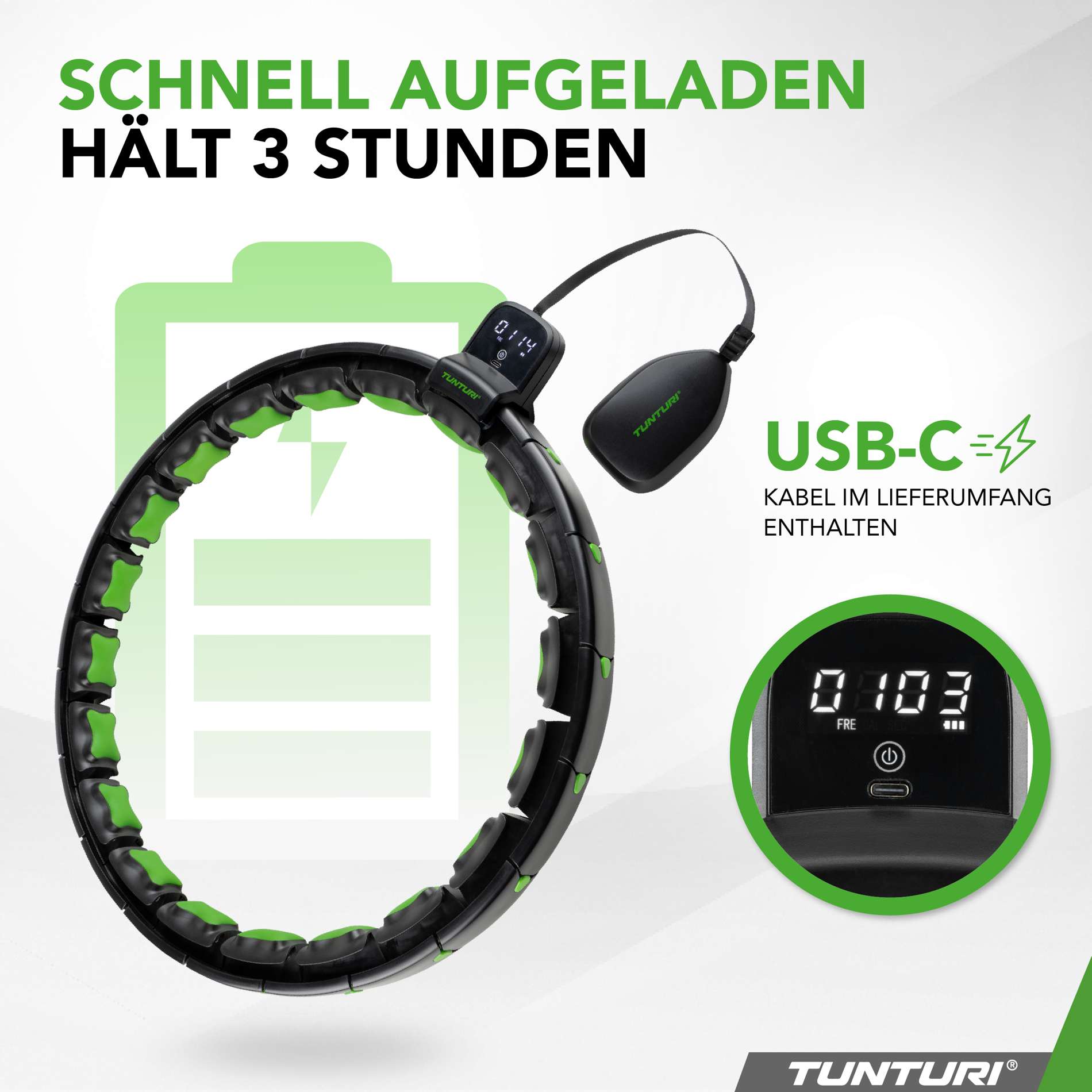Hey, Lust auf ein effektives Workout das auch noch Spaß macht? Dieser smarte Hula-Hoop von Tunturi ist dein neuer bester Freund! Verstellbar von 44 bis 106 cm Umfang - passt also für jeden Körpertyp. Mit 1,3 kg Gewicht und integriertem Massage-Ball trainiert er super effektiv deine Taille und Rumpfmuskulatur. Das eingebaute Display zeigt dir Kalorienverbrauch, Trainingsdauer und Rotationen an - so behältst du deine Fortschritte immer im Blick! 15 Minuten Training entsprechen etwa 30 Minuten Schwimmen - mega effizient! Per USB-C aufladbar und hält bis zu 3 Stunden. Die weiche Innenseite macht das Training angenehm, und der Gewichtsball sorgt für extra Herausforderung. Macht nicht nur schlank, sondern auch noch gute Laune! Einfach zusammensetzen, losschwingen und fit werden mit Spaß!