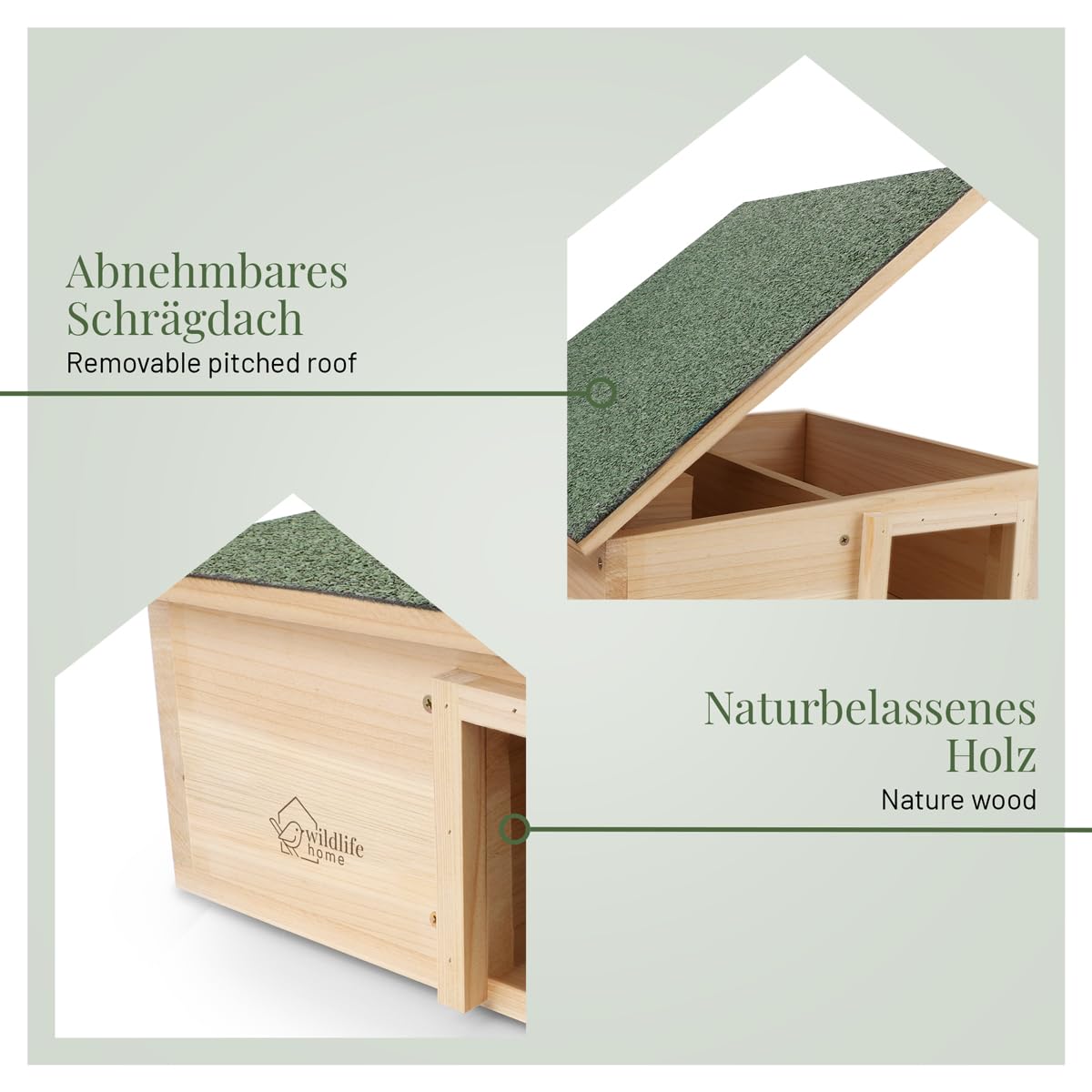 Oh, wie niedlich! Dieses Igelhaus von URBNLIVING ist der perfekte Unterschlupf für deine stacheligen Gartenbesucher. Aus unbehandeltem Holz gefertigt - ganz wichtig, denn behandeltes Holz gibt Dämpfe ab die Igel nicht vertragen. Mit zwei gemütlichen Räumen und nem abnehmbaren Bitumendach das absolut regendicht ist. Die kleine Eingangsöffnung (Maße: 18x35x35 cm) ist perfekt dimensioniert: Igel kommen easy rein, aber Füchse und andere Räuber haben keine Chance. Super wichtig im Winter, damit die Tierchen sicher überwintern können und nicht in gefährlichen Holzstapeln Unterschlupf suchen. Auch im Sommer ein toller Schutz vor Hitze. Einfach im Garten aufstellen und den Igeln ein sicheres Zuhause bieten - die werden's dir danken! Perfekt für alle Tierfreunde die was Gutes tun wollen.