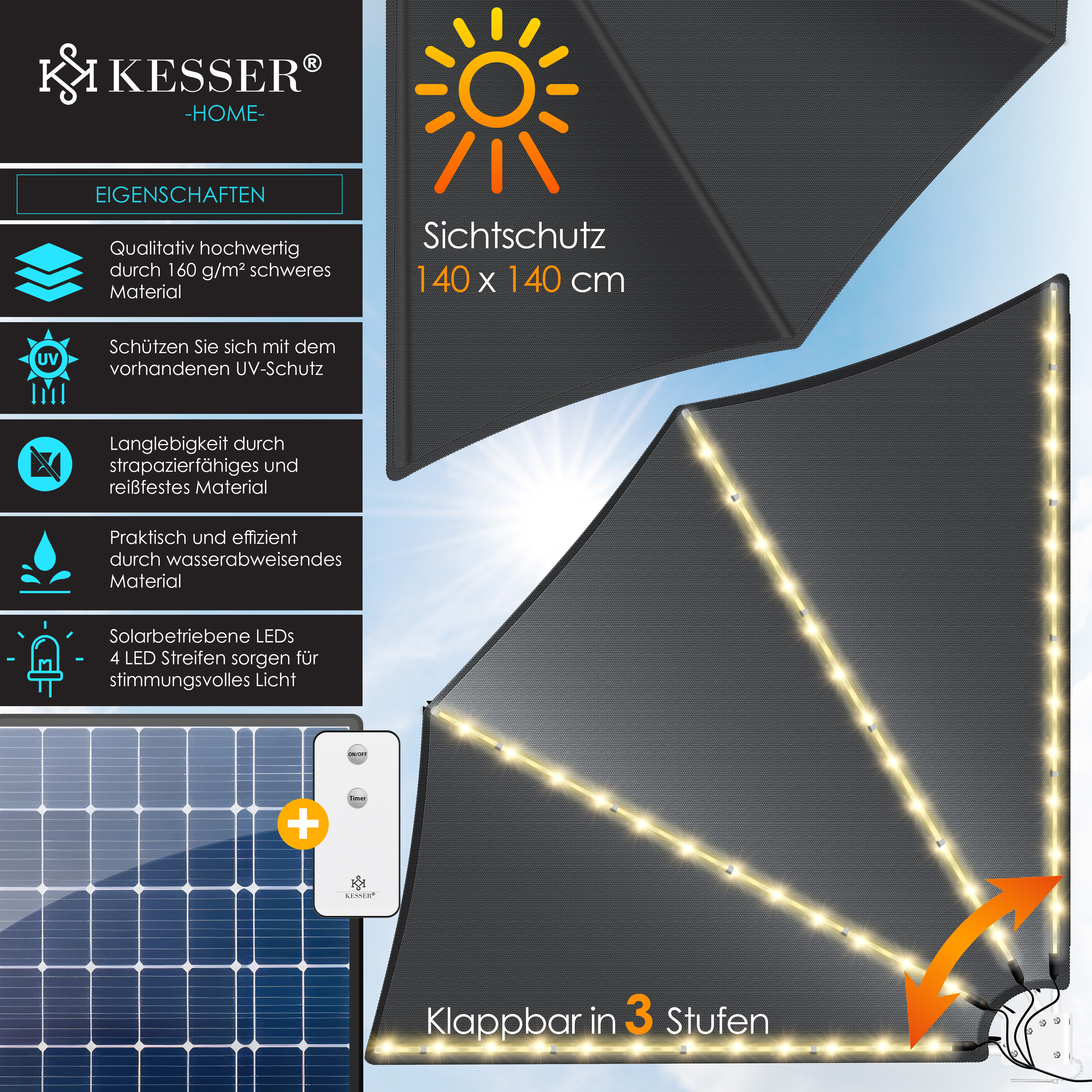 Dieses praktische Sonnensegel in Rechteckform 120x140cm ist der perfekte Sonnenschutz für deinen Balkon, Garten oder Terrasse. Aus hochwertigem HDPE-Gewebe blockiert es 98% der UV-Strahlen und bietet zuverlässigen Schutz vor der Sonne. Dabei ist es atmungsaktiv - Regenwasser sammelt sich nicht, sondern läuft einfach ab. Die robusten Aluminium-Ösen im Abstand von 50cm sorgen für sicheren Halt. Mit dabei: 5m Nylon-Kordelzug und 15 Kabelbinder für die einfache Montage. Ob über der Sitzgruppe, dem Sandkasten oder dem Pool - mit diesem Segel genießt du den Sommer ohne Sonnenbrand!