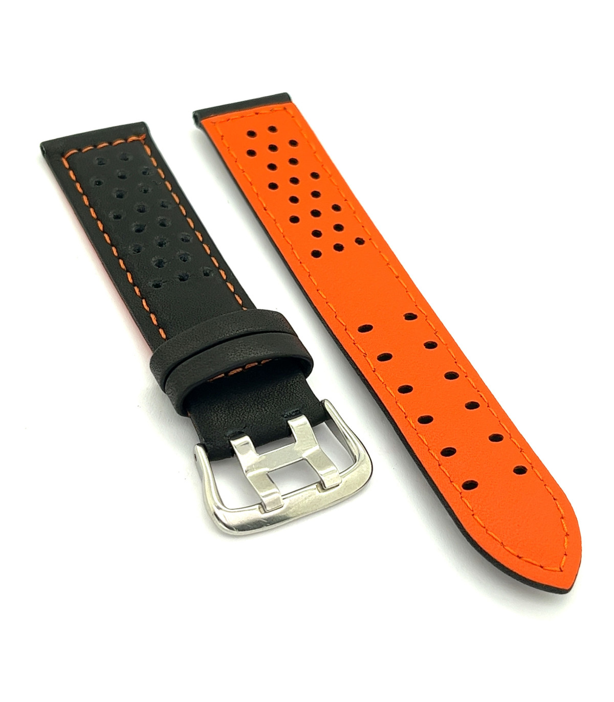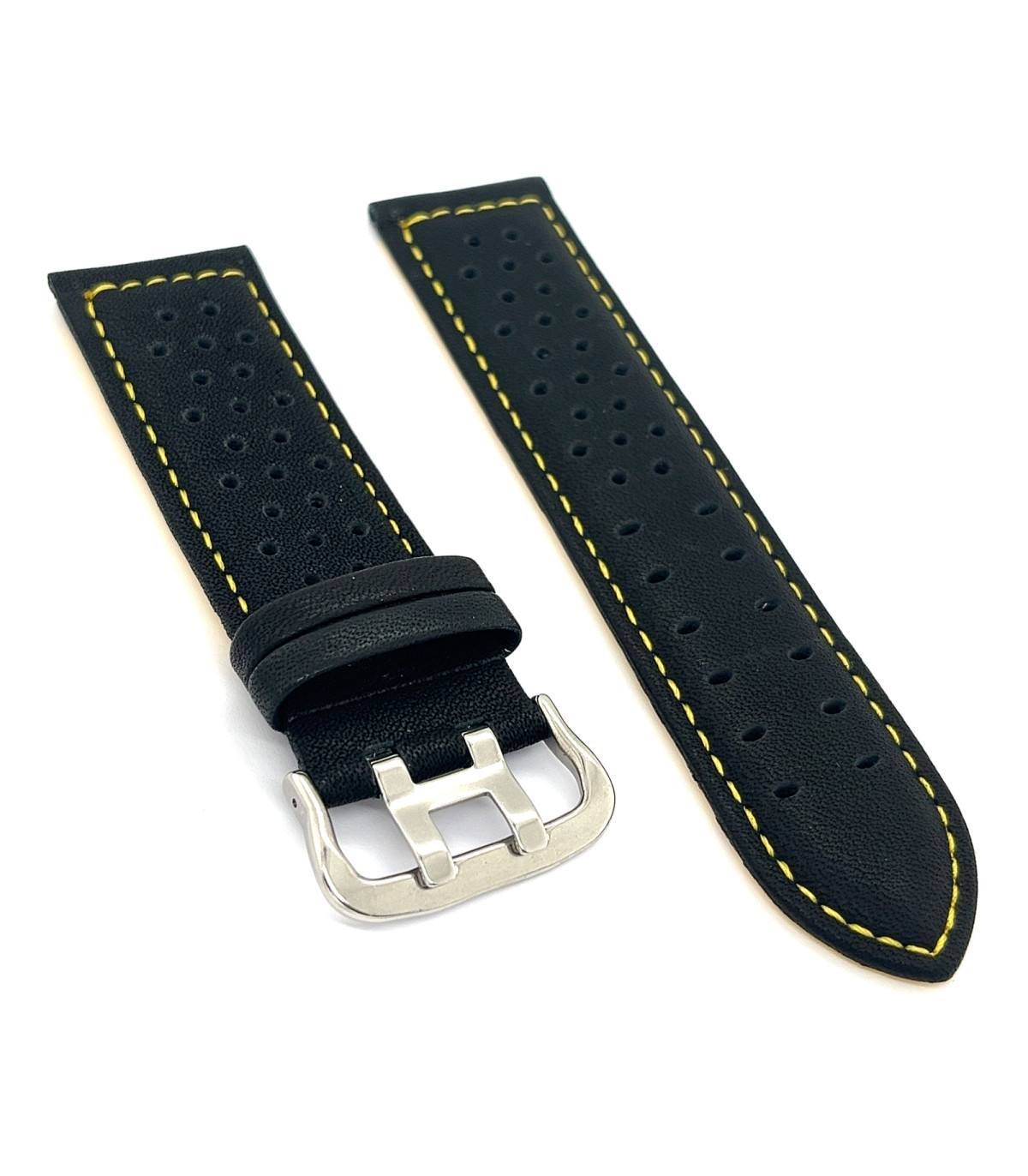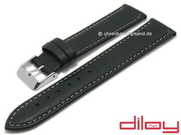 Dieses diloy Uhrenarmband aus echtem Rindsleder ist ein echter Hingucker! Erhältlich in 5 coolen Farbkombinationen - Schwarz mit rot, blau, gelb, orange oder weißer Naht. Die Perforierung gibt ihm diesen sportlichen Rallye-Look, und die bunte Naht setzt tolle Akzente. Das Futter ist aus schweißbeständigem, antiallergischem Leder - super angenehm auf der Haut! Passt für Handgelenke von 13,5-17,5 cm Umfang. Wichtig: Bitte nicht nass machen, denn Leder mag kein Wasser. Auch Parfum und andere Lösungsmittel können dem Armband schaden. Einfach das alte Band ab, das neue drauf - und deine Uhr sieht aus wie neu! Perfekt für alle, die ihrem Zeitmesser einen frischen, sportlichen Look verpassen wollen. Ob zur Jeans oder zum Anzug - dieses Armband passt immer!