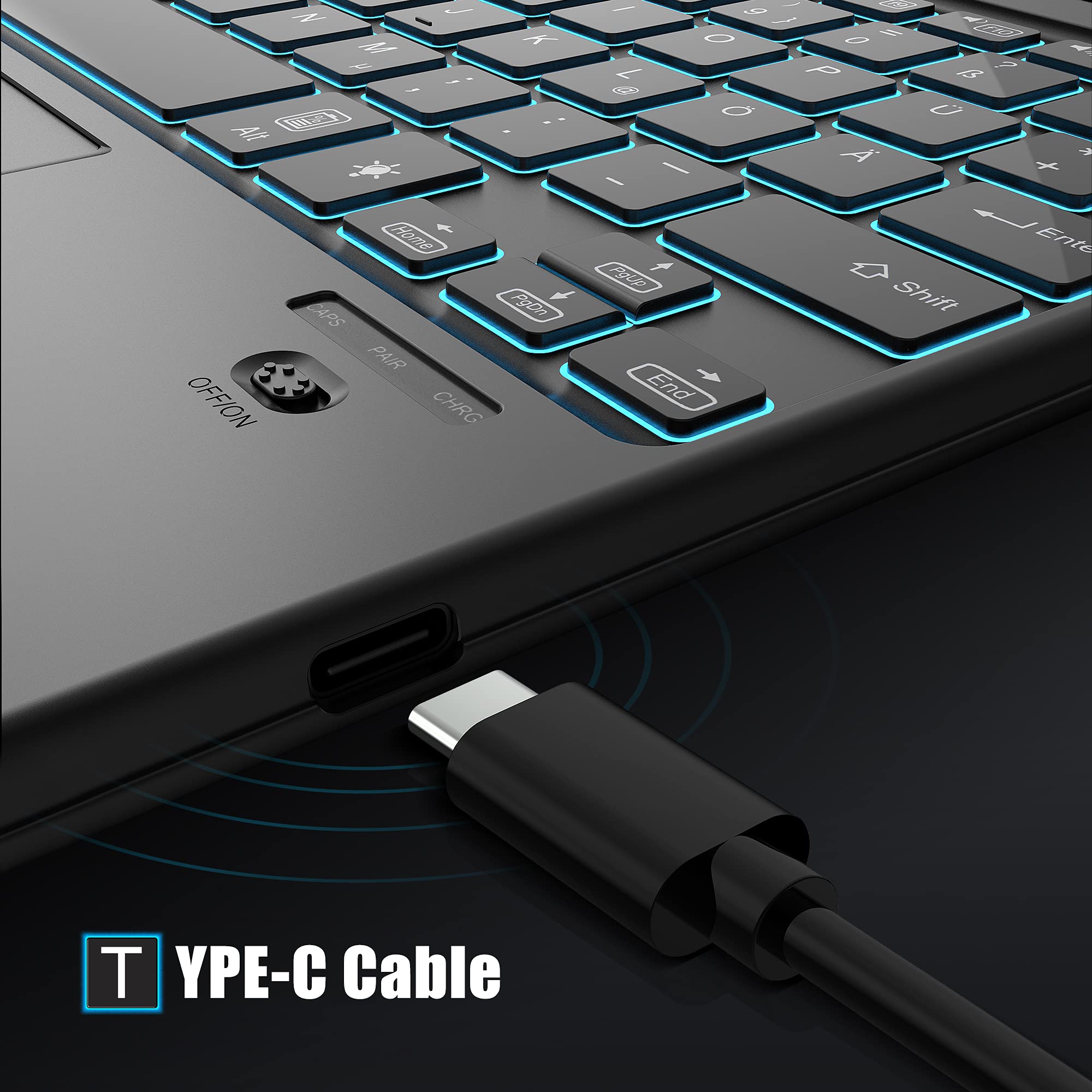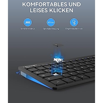 Endlich Ordnung auf dem Schreibtisch! Diese kabellose Tastatur von TECKNET verbindet sich mit bis zu 4 Geräten gleichzeitig - wechsle einfach per Knopfdruck zwischen PC, Laptop, Tablet und Smartphone. Das ultraflache Design sieht nicht nur stylisch aus, sondern spart auch Platz. Mit deutschem QWERTZ-Layout gewöhnst du dich sofort daran. Die leisen Scherentasten reduzieren die Geräusche um 90% - perfekt fürs Büro oder Home-Office! Der integrierte 500-mAh-Akku hält bis zu 180 Tage (bei 2h Nutzung täglich). Nach 30 Minuten Inaktivität schaltet sich die Tastatur automatisch in den Energiesparmodus. Die ergonomische Neigungseinstellung (3° oder 7°) und die Anti-Rutsch-Pads sorgen für komfortables Tippen. Kompatibel mit Windows, macOS, iOS, Android und Chrome OS. Im Lieferumfang: Tastatur, USB-C-Ladekabel, Benutzerhandbuch. Mit 36 Monaten Support - einfach registrieren und sorgenfrei tippen! Perfekt für alle, die mehrere Geräte nutzen und nicht ständig Kabel wechseln wollen!