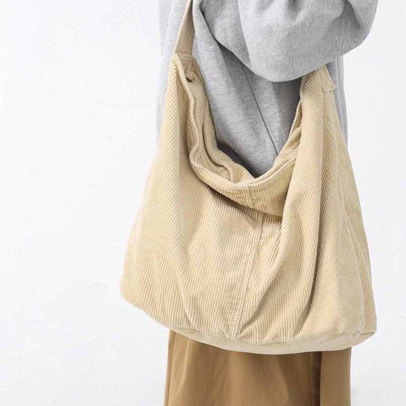 Das Cord-Material ist nicht nur stylisch, sondern auch praktisch: Weich, umweltfreundlich und die Farben bleichen nicht aus. Der geflochtene Träger liegt super bequem auf der Schulter - kein Einschneiden auch bei vollem Inhalt.