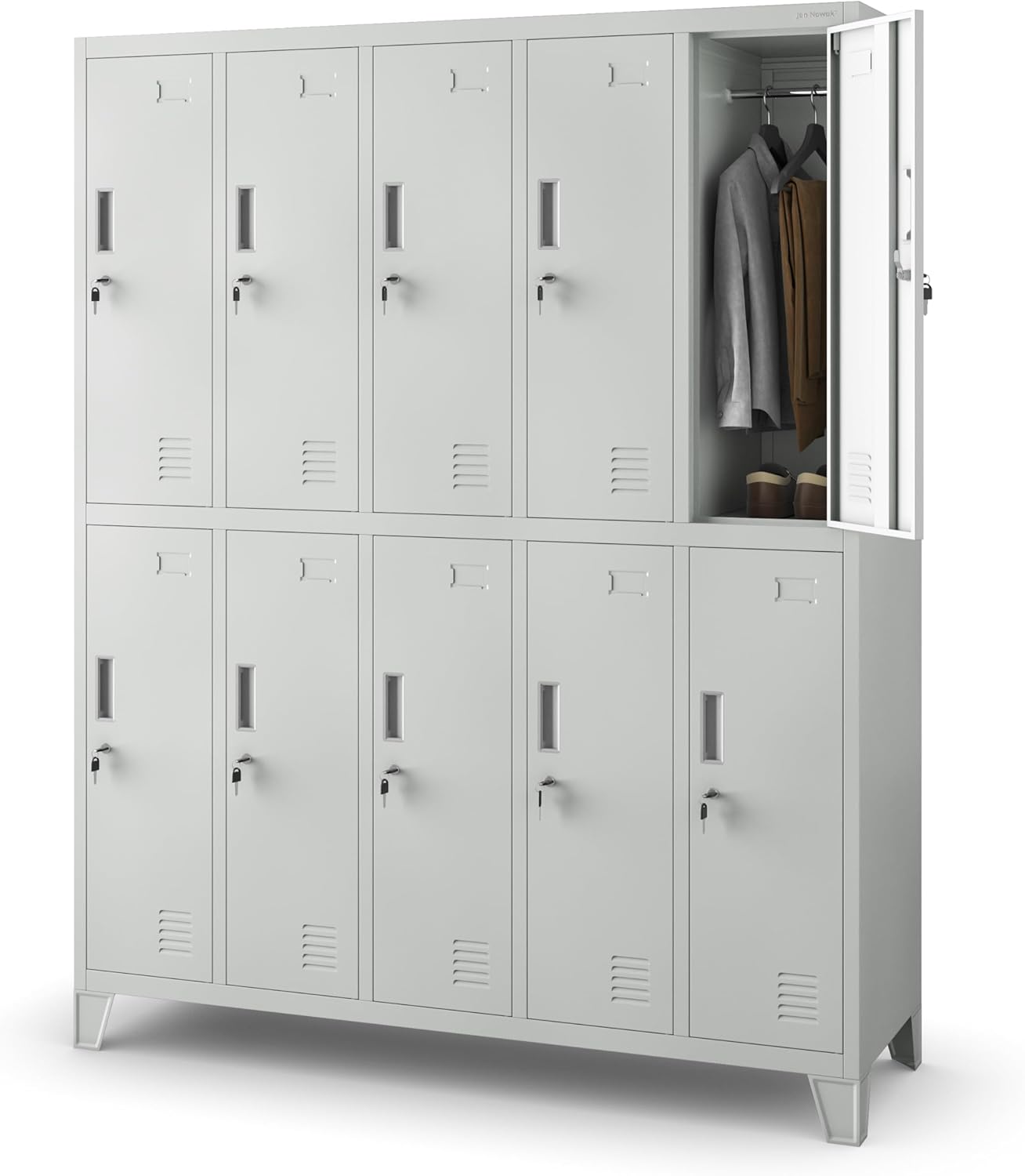 Ordnung muss sein! Dieser robuste Umkleideschrank von Jan Nowak bringt System in jeden Umkleidebereich. Mit 10 geräumigen Fächern bietet er Platz für die persönlichen Sachen von bis zu 10 Personen.\n\nJedes Fach hat eine abschließbare Tür mit praktischem Kunststoffgriff, Lüftungsschlitzen für frische Luft und einem Etikettenhalter zur Beschriftung. Innen wartet eine Kleiderstange auf Jacken und Hosen.\n\nAus pulverbeschichtetem Stahl (0,6mm Dicke) gefertigt, hält dieser Schrank wirklich was aus. Die Zylinderschlösser mit je zwei Schlüsseln sorgen für Sicherheit, während die stabile Konstruktion (66kg Gewicht) für Langlebigkeit steht.\n\nPerfekt für:\n• Schulen und Kindergärten\n• Fitnessstudios und Schwimmbäder\n• Betriebe und Werkstätten\n• Sportvereine\n\nMaße: 172cm (H) x 136cm (B) x 45cm (T)\n\nLieferung per Spedition - bitte gültige Telefonnummer für die Terminabsprache hinterlegen!\n\nEin echter Allrounder für jeden gewerblichen Umkleidebereich!