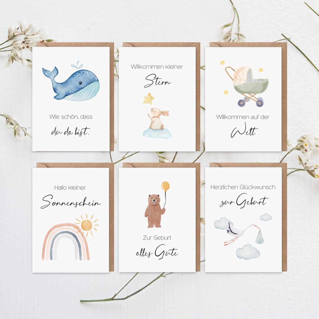 5er Set Geburtskarten Mit Umschlägen - Glückwunschkarten Zur Geburt