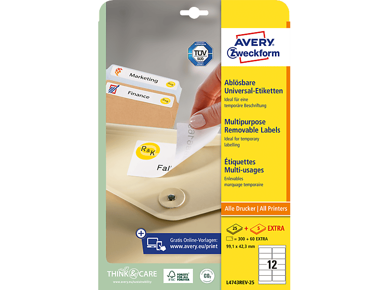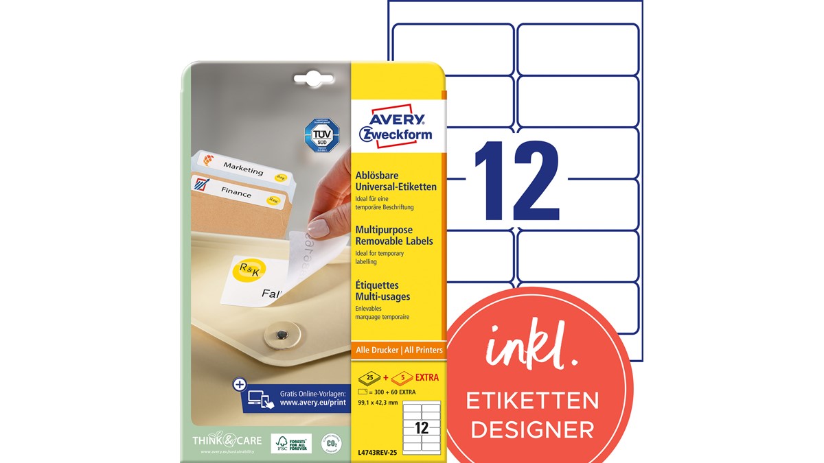 Diese AVERY Etiketten sind echt praktisch! 360 Stück im Format 99,1x42,3mm - das reicht für alle deine Beschriftungs-Projekte. Das Besondere: Sie sind wiederablösbar! Das heißt, du kannst sie sicher aufkleben und später rückstandslos wieder abziehen. Perfekt für temporäre Beschriftungen oder wenn sich mal was ändert. Mit dem kostenlosen Online-Designer von AVERY kannst du dir ganz easy individuelle Etiketten gestalten - ob mit Text, Logo oder Bildern. Die Etiketten sind TÜV-geprüft für Laserdrucker und laufen super durch ohne Kleberückstände. Aus FSC-zertifiziertem Papier und made in Germany - also auch noch umweltfreundlich. Ob für Ordnung im Büro, Beschriftung von Produkten oder Organisation zu Hause - diese Etiketten sind dein bester Helfer. Einfach ausdrucken, aufkleben und bei Bedarf wieder abziehen - praktischer geht's kaum!