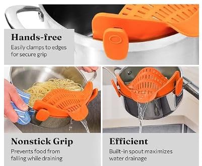 Kennst du das? Nudeln abgießen und alles schwappt über? Mit diesem praktischen Silikon-Sieb gehört das der Vergangenheit an! Einfach an den Topfrand klippen und abgießen - ohne lästiges Hin- und Hertragen. Passt an fast alle runden Töpfe, Pfannen und Schalen. Aus lebensmittelechtem Silikon und Edelstahl, spülmaschinengeeignet und platzsparend. Nur etwa 23cm groß und super leicht. Die zwei robusten Clips halten sicher, und du verbrennst dir nicht die Finger wie bei herkömmlichen Sieben. Perfekt für Nudeln, Reis, Gemüse oder zum Abseihen von Brühe. Macht die Küchenarbeit viel einfacher und sauberer. Ein echter Game-Changer für jede Küche - ob für Profis oder Hobbyköche!