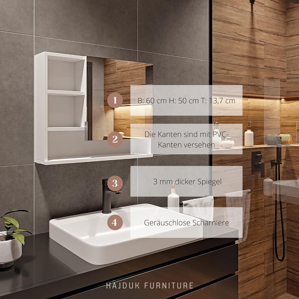 Mit den Maßen 60x38,5x45 cm (BxTxH) passt das Set auch in kleinere Badezimmer. Einfach zusammenbauen, an der Wand montieren und sich über das nagelneue Badezimmer freuen. Stilvoll, praktisch und komplett - was will man mehr?
