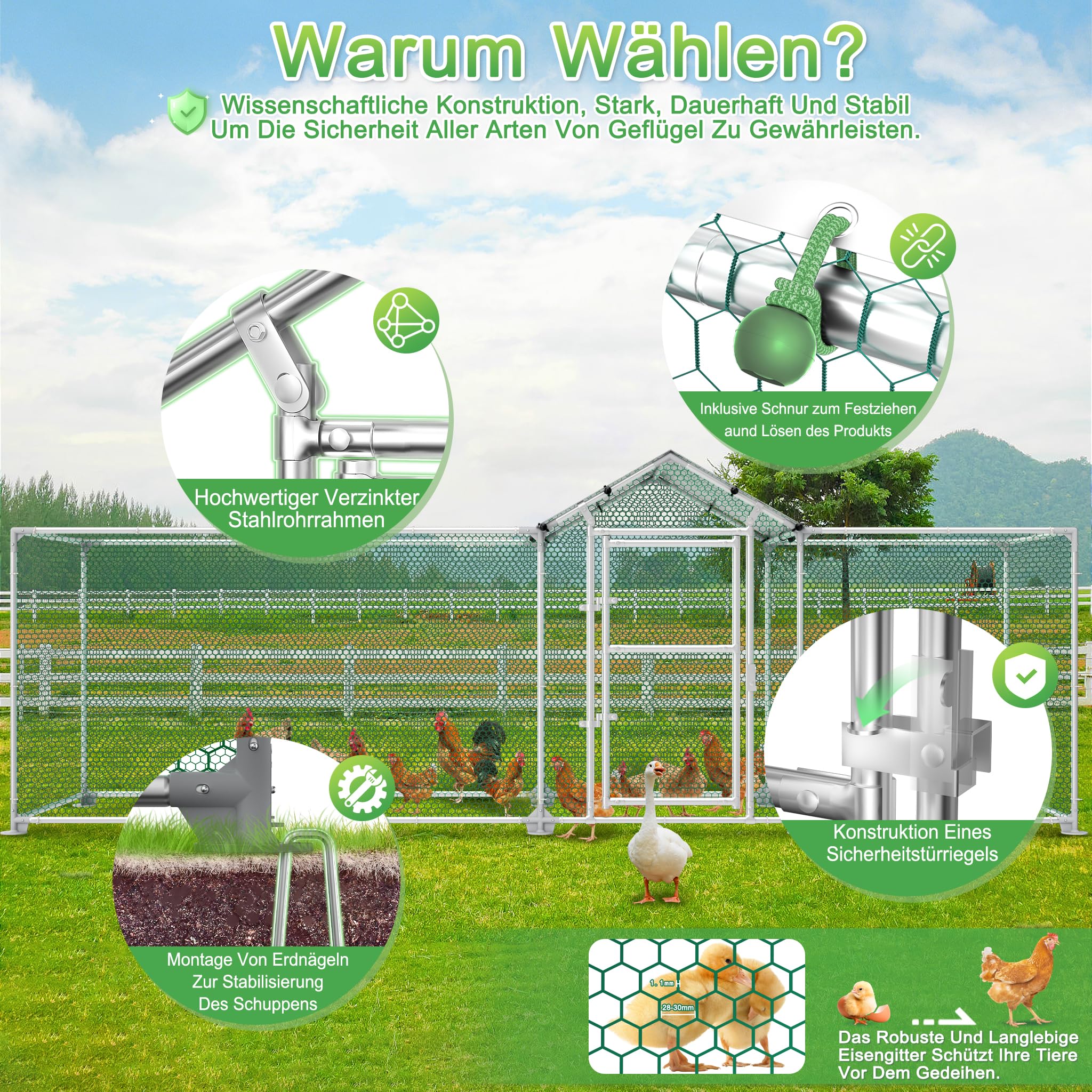Sicherer Auslauf für deine Tiere! Dieses VANCHEMO Freilaufgehege in 2x1x1,5m bietet Hühnern, Kaninchen und anderen Kleintieren optimale Bedingungen. Aus verzinktem Stahlrohr gefertigt - rostgeschützt und extrem langlebig. Mit PVC-beschichtetem Sechseckgitter (1,1mm Drahtstärke, 25mm Maschenweite) für maximale Sicherheit. Das UV-beständige PE-Sonnendach schützt vor Regen und schädlicher Strahlung. Die praktische Schiebetür mit sicherem Verschluss ermöglicht einfachen Zugang. Einfache Montage dank Federriegel-System - schnell aufgebaut und sofort bezugsbereit. Ideal für Garten, Terrasse oder Hof. Schützt deine Tiere vor Raubtieren und bietet gleichzeitig genug Platz zum Spielen und Ausruhen. Auch perfekt als temporäres Gehege oder für die Eingewöhnung neuer Tiere. Mit diesem robusten Gehege schaffst du eine artgerechte Umgebung für deine gefiederten und felltragenden Freunde!