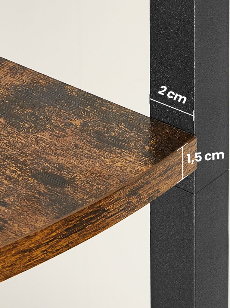 Geniale Platznutzung für jede Ecke! Dieses VASAGLE Eckregal verwandelt ungenutzte Raumecken in praktischen Stauraum. Mit 5 Ebenen - 4 offene Ablagen und 1 geschlossenes Schränkchen für persönliche Gegenstände. Aus robusten Holzspanplatten und stabilem Stahlrahmen gefertigt. Maße: 25,4x44,5x147,3cm (TxBxH). Belastbarkeit bis 22kg pro Ablage, 104kg gesamt. Verstellbare Füße für optimalen Stand, inklusive Kippschutz für maximale Sicherheit. Einfache Montage mit bebilderter Anleitung. Perfekt für Wohnzimmer, Schlafzimmer, Küche oder Flur.