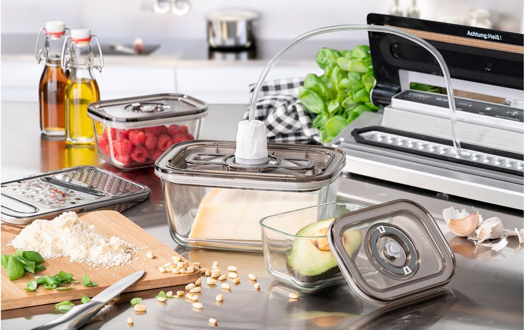 Schluss mit weggeworfenen Lebensmitteln! Dieses 3-teilige Vakuumbehälter-Set hält dein Essen bis zu 3x länger frisch. Die cleveren Glasbehälter gibt es in drei praktischen Größen: Klein (0,4L), Mittel (1L) und Groß (1,3L) - perfekt für Reste, Vorräte oder Meal Prep. Das geniale Feature: Jeder Deckel hat ein integriertes Datumsrad! So siehst du immer, wann du was vakuumiert hast und behältst den Überblick über deine Vorräte. Die mitgelieferte Handpumpe saugt die Luft raus - ohne Strom, ohne komplizierte Technik. Aus Borosilikatglas sind die Dosen ofenfest bis 250°C und spülmaschinengeeignet (nur die Behälter, nicht die Deckel). Die Deckel sind BPA-frei und haben eine Silikondichtung für absolute Luftdichtheit. Super praktisch: Die Boxen sind stapelbar und sparen Platz im Kühlschrank. Ob für Käse, Wurst, Gemüse oder trockene Lebensmittel - mit diesem Set hast du deine Küchenvorräte immer im Griff und reduzierst Lebensmittelverschwendung. Einfach befüllen, Luft rauspumpen und sich über länger frisches Essen freuen!