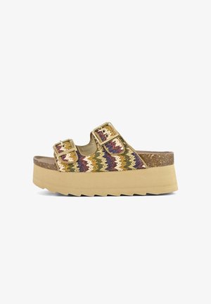Wow, diese Palado Pantoletten von Sila Sahin sind einfach nur stylisch! Die Veast Sandalen haben eine coole 4cm Plateau-Sohle (bei Größe 37) und sehen einfach mega aus. Die zwei breiten Riemen sind aus samtigem Material - fühlt sich nicht nur gut an, sieht auch total edel aus. Die goldfarbenen Schnallen sind nicht nur Deko, du kannst sie auch verstellen für perfekten Halt. Und die Sohle mit dieser geflochtenen Umrandung? Einfach nur trendy! Ob für den Alltag oder besondere Anlässe - mit diesen Sandalen machst du immer was her. Sie kombinieren totalen Komfort mit anspruchsvollem Design. Perfekt für warme Tage, Stadtbummel oder Dates. Und weil's von Sila Sahins Kollektion ist, weißt du: Da steckt Style-Know-how drin! Das gepolsterte Fußbett sorgt dafür, dass du auch länger bequem unterwegs bist. Hol dir diesen Sommer-Look und fühl dich wie ein Star!