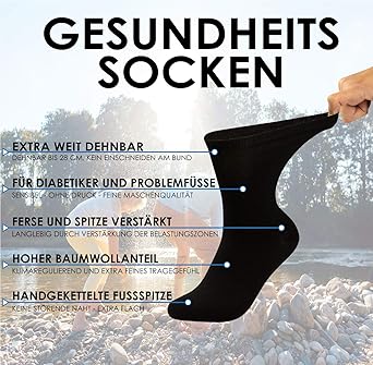 Endlich Socken, die nicht einschneiden! Diese RS. Harmony Gesundheitssocken sind speziell für Männer mit kräftigeren Waden oder venösen Problemen entwickelt. Der extra weite Komfortbund dehnt sich bis zu 46cm - ohne zu verrutschen! Perfekt also bei geschwollenen Beinen, Lipödem oder einfach wenn normale Socken immer drücken. Die Mischung aus 75% Baumwolle und Elasthan macht sie super atmungsaktiv und bequem. Besonders praktisch: Die verstärkten Belastungszonen an Ferse und Spitze sorgen für lange Haltbarkeit. Und die flache Naht an den Zehen verhindert lästige Druckstellen. Als deutsches Unternehmen legen sie Wert auf faire Produktion und Qualität. Noch unsicher? 30 Tage Testphase ohne Risiko! Und falls doch mal ein Loch sein sollte: 180 Tage Anti-Loch-Garantie! Egal ob für den Alltag, Büro oder Freizeit - diese Socken machen einfach jeden Tag angenehmer. Deine Füße werden's dir danken!