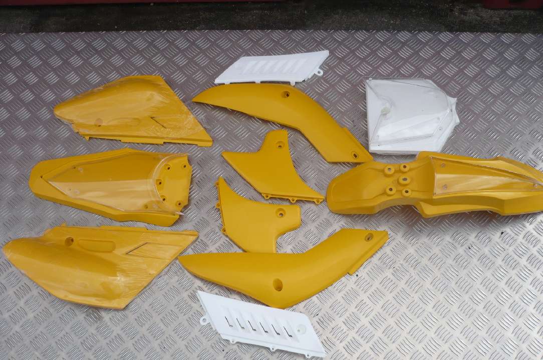 Mach dein Dirt Bike wieder fit! Dieses komplette 7-teilige Verkleidungsset in kräftigem Grün passt perfekt für Pit Bikes und Dirt Bikes mit 125-150ccm und 17/14 Zoll Rädern. Aus robustem Kunststoff gefertigt, übersteht es auch mal eine unsanfte Landung. Einfacher Einbau - tausche die alten, beschädigten Verkleidungsteile gegen diese neuen aus und dein Bike sieht aus wie neu! Ideal für alle, die ihr Motorrad wieder auf Vordermann bringen wollen ohne viel Geld auszugeben. Perfekt für die Motocross-Strecke, den Trail oder einfach nur zum Cruisen. Hol dir jetzt den frischen Look für deinen fahrbaren Untersatz und dreh wieder richtig auf! Komplett-Set - alles dabei, was du für die optische Aufwertung brauchst.