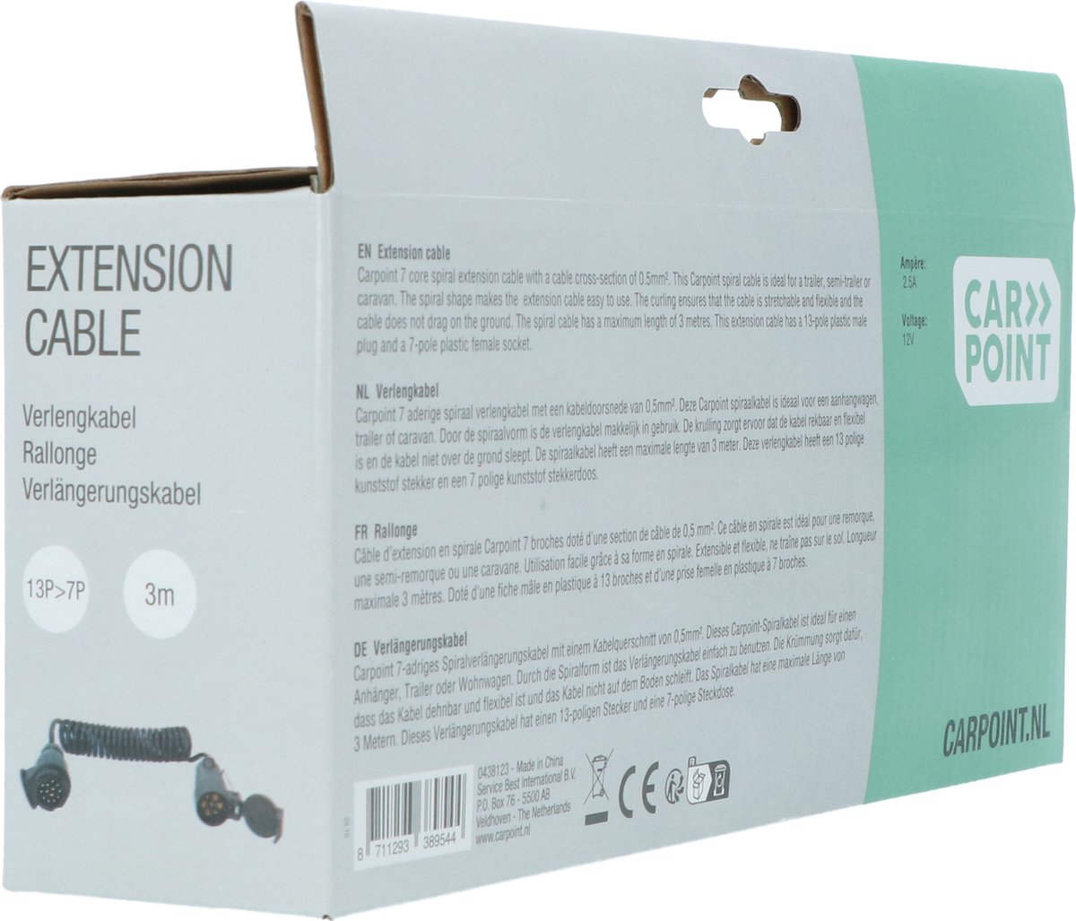 Dieses praktische Spiralkabel ist die perfekte Verlängerung für deinen Anhänger oder Wohnwagen! Mit 7 Polen und 0,5mm² Kabelquerschnitt sorgt es für zuverlässige Verbindung zwischen Auto und Anhänger. Das geniale Spiraldesign dehnt sich von 26 cm auf volle 3 Meter - super flexibel und praktisch, denn das Kabel schleift nicht mehr auf der Straße! Die beiden 7-poligen Metallstecker sind robust und langlebig. Perfekt für alle, die regelmäßig Anhänger, Trailer oder Wohnwagen ziehen. Einfach zwischen Steckdose und Anhängerstecker klemmen und schon bist du startklar. Von Carpoint - einer niederländischen Premiummarke, die für Qualität und Zuverlässigkeit bekannt ist.
