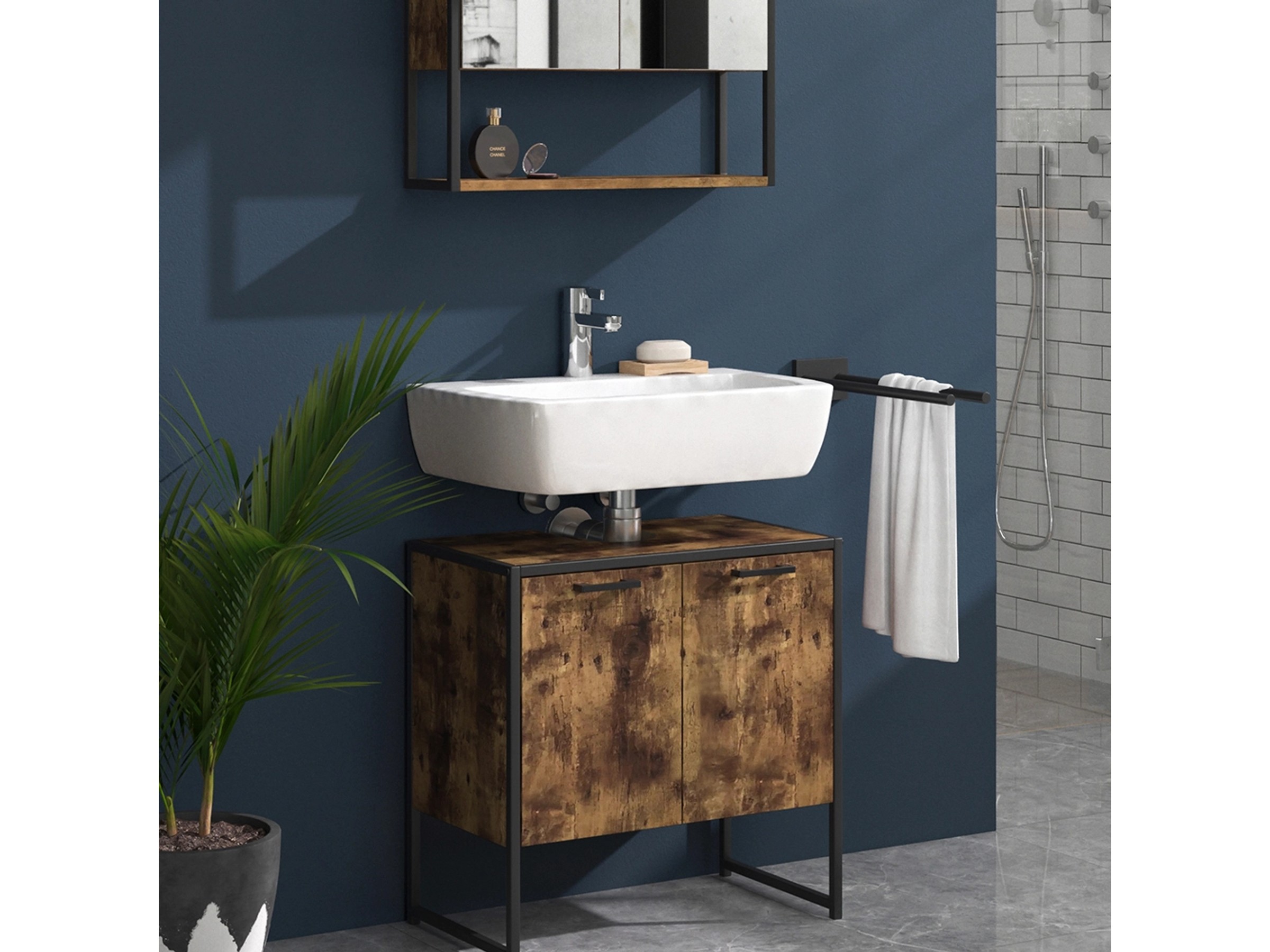 Dein Bad braucht mal ein Update? Dieses Vicco Badmöbel-Set im trendigen Industriestil ist genau das Richtige! Antikholz-Optik meets schwarzes Metallgestell - sieht einfach hammer aus. Im Set dabei: ein praktischer Spiegelschrank mit Ablage, ein Waschbeckenunterschrank und ein geräumiger Midischrank. Alles aus pflegeleichter Spanplatte, feuchtigkeitsbeständig und mega langlebig. Viel Stauraum für all deine Badezimmer-Krimskrams - endlich Ordnung im Bad! Die variablen Einlegeböden kannst du nach Bedarf anpassen. Einfach montieren und sich über das neue Wohlfühl-Bad freuen. Lieferung inklusive Montagematerial - alles da, was du brauchst!