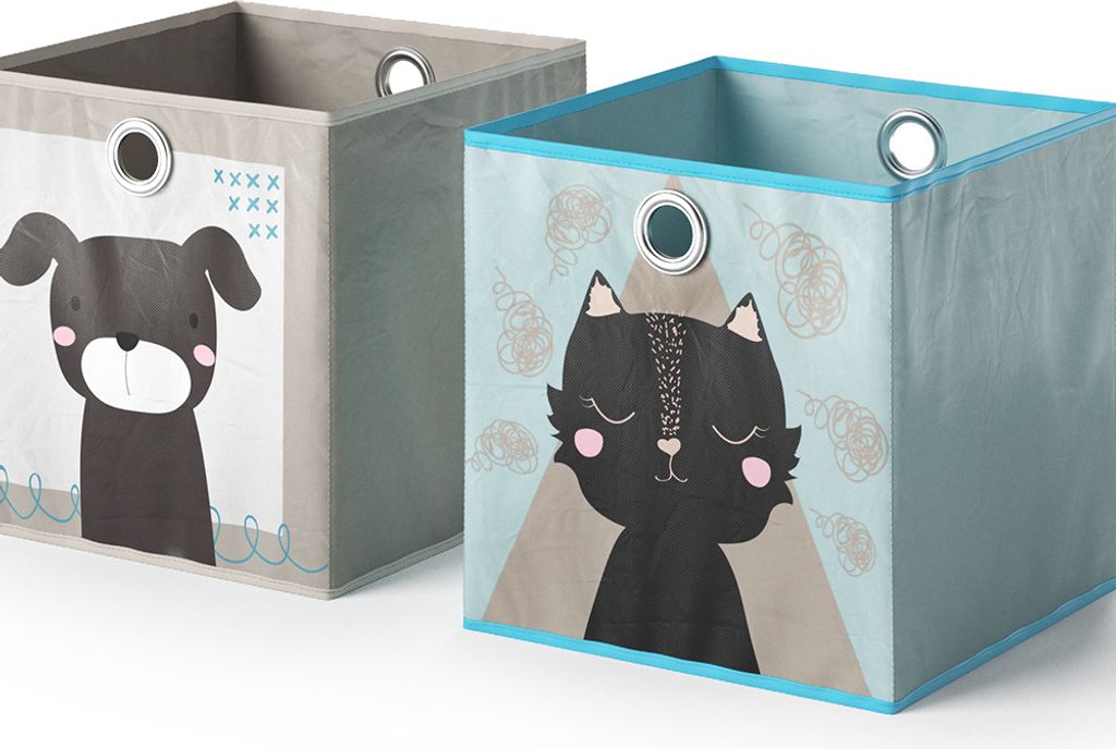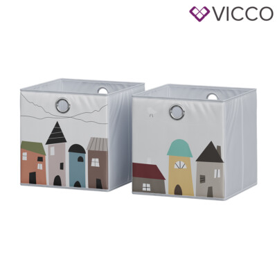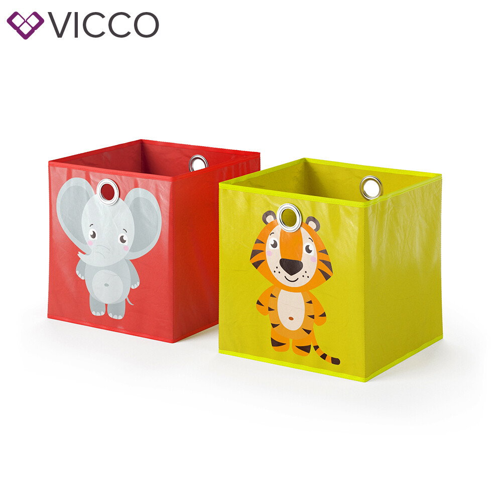 Hey, diese süßen Faltboxen von Vicco sind einfach perfekt fürs Kinderzimmer! Im 2er-Set mit den Maßen 30x30x30cm - ideal für Spielzeug, Bücher und all den Kram, der sonst überall rumliegt. Die Boxen haben auf Vorder- und Rückseite verschiedene Tier-Motive wie Hase, Katze, Nilpferd und Fuchs, die Kinderaugen zum Strahlen bringen!\\n\\nHergestellt aus stabilem Hartkarton mit Kunststoffvlies - das ist richtig robust und sogar abwaschbar! Super praktisch sind die Metallösen an zwei Seiten, damit lässt sich jede Box ganz easy aus Regalen oder Schränken ziehen.\\n\\nDie Boxen passen perfekt in Schreibtische, Schränke, Regale und Raumteiler. So wird Aufräumen zum Kinderspiel und das Zimmer sieht immer ordentlich aus! Mit 600g pro Box sind sie leicht genug für Kinderhände, aber stabil genug für den täglichen Gebrauch.\\n\\nEinfach zusammenfalten, wenn du sie mal nicht brauchst - platzsparend und praktisch! Die Farben in Türkis, Grau und Hellblau sehen fröhlich aus und passen in jedes Kinderzimmer. Ein Must-Have für alle Familien mit Kindern - endlich Ordnung mit Style!