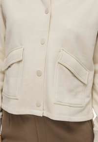 Aus der Materialmischung 60% Baumwolle und 40% recyceltem Polyester ist die Jacke angenehm zu tragen und nachhaltig produziert. Der gerippte Rundhalsausschnitt und die gerippten Ärmelbündchen geben ihr den besonderen Look.