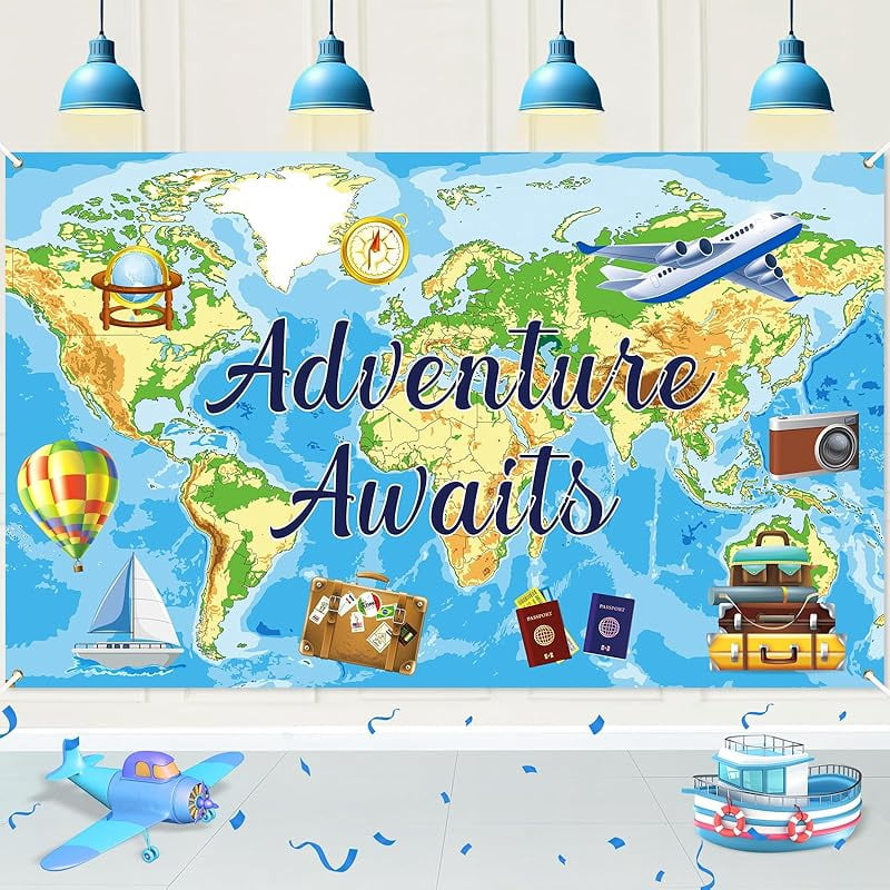 Abenteuer warten! Dieses vintage-style Banner mit der Aufschrift 'Adventure Awaits' verleiht jeder Feier einen besonderen Charme. Perfekt für Geburtstage, Abschlussfeiern, Rentenpartys oder Abschiedsfeiern mit Reise-Thema. Das Set enthält 2 Banner, die sich wunderbar mit Globus-Dekorationen und Pass-Einladungen kombinieren lassen. Ob im Garten, in der Bibliothek oder im Wohnzimmer - dieses Banner sorgt für die perfekte Atmosphäre für alle, die das Reisen lieben oder in ein neues Abenteuer starten. Einfach aufhängen und die Party kann beginnen!