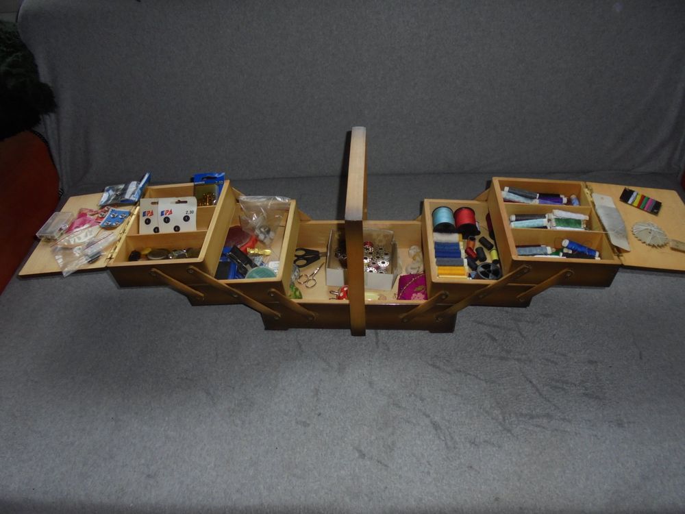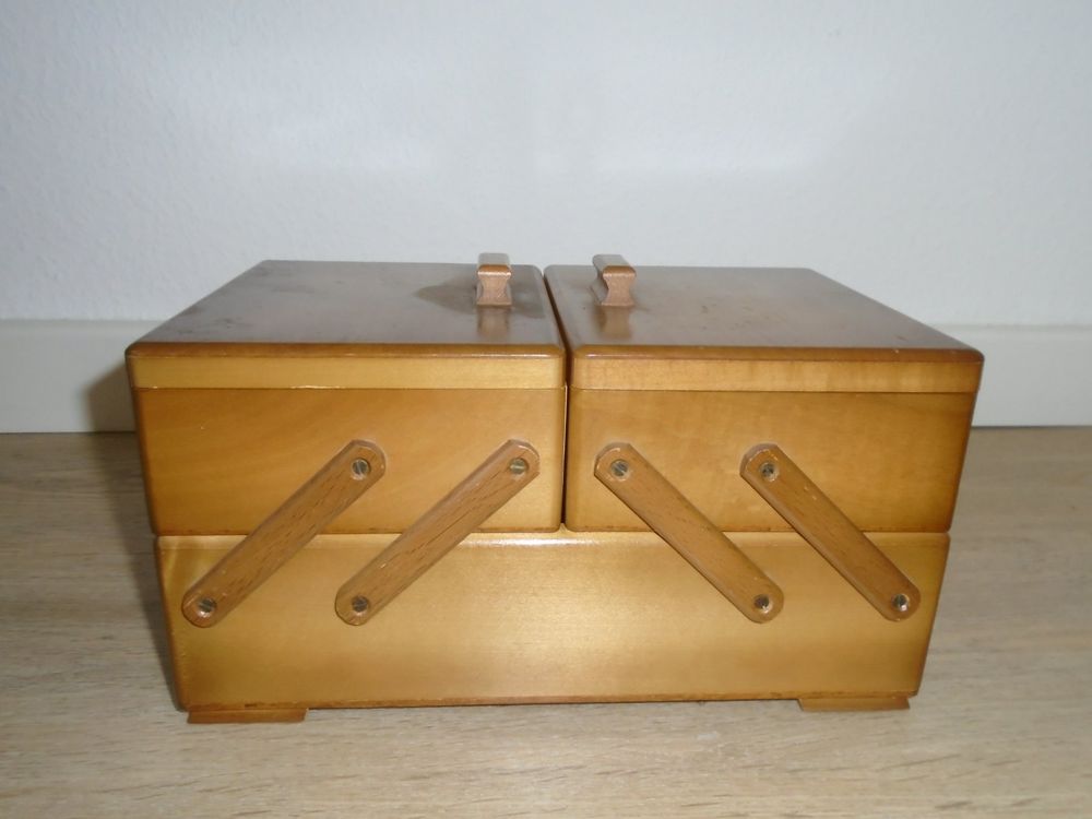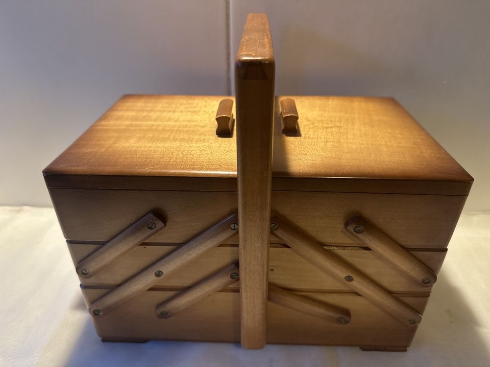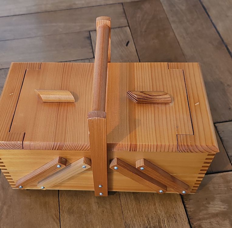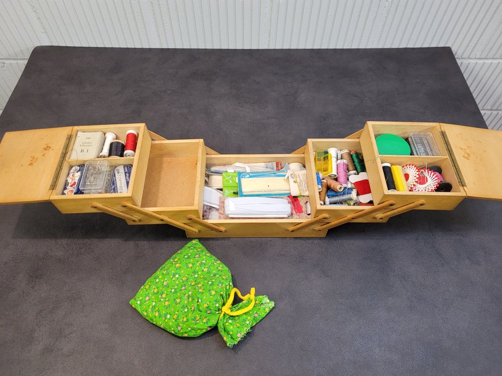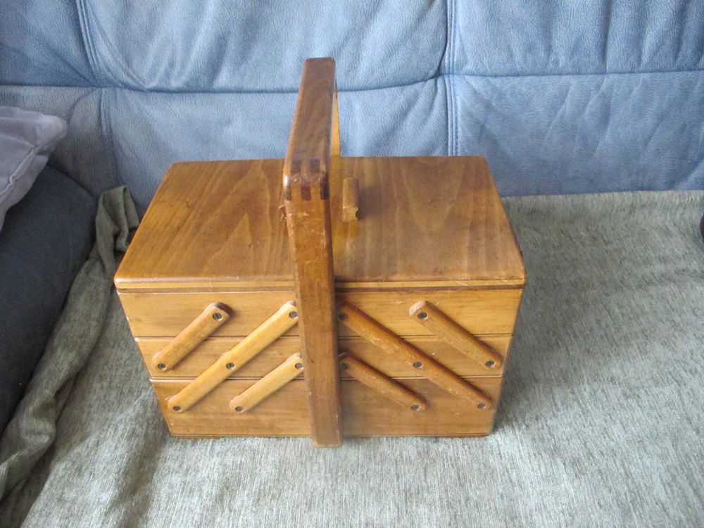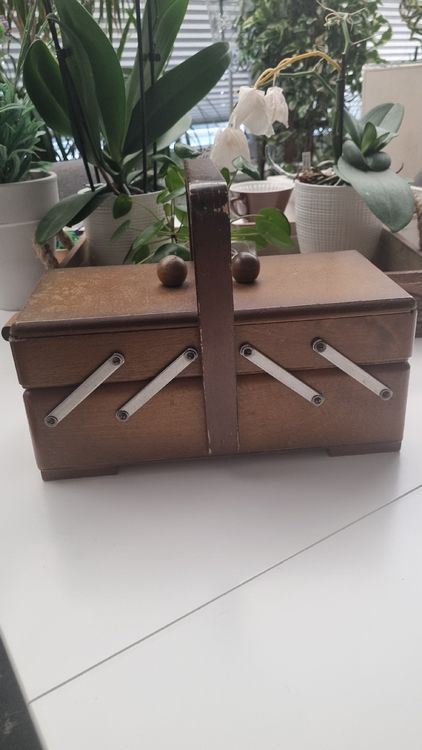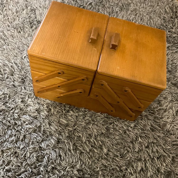 Nähen macht mit diesem hübschen Holzkasten noch mehr Spaß! Im vintage Stil mit süßem gemustertem Nadelkissen im Deckel. Maße: 21,5x13,5x9cm - also kompakt aber geräumig genug für alle Nähutensilien. Perfekt für Nadeln, Stecknadeln, Knöpfe, Perlen und anderes Kleinzeug. Das Holz ist robust und langlebig, der Kasten super handlich zum Transportieren. Ob für dich selbst oder als Geschenk für eine nähende Freundin - dieser Organizer ist einfach praktisch und sieht dabei noch richtig charmant aus. Kann auch als Schmuckkästchen oder für andere Bastelsachen verwendet werden. Einfach ein vielseitiges Stück das in keiner Näh-Ecke fehlen sollte!