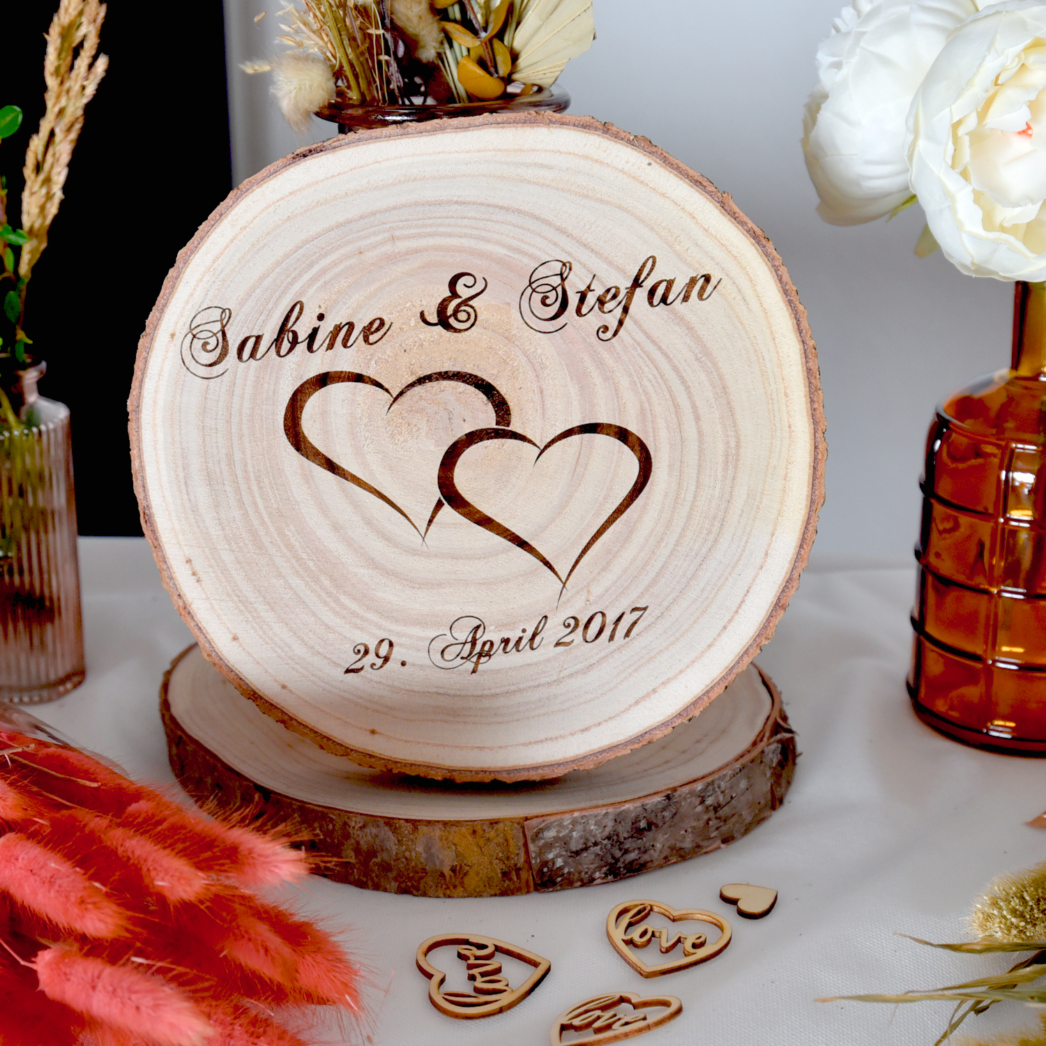 Suchst du ein besonderes Geschenk zur Hochzeit? Die Casa Vivente Baumscheibe ist total romantisch und wird personalisiert mit Namen und Datum - ein echtes Unikat! Hergestellt aus naturbelassenem Erlen-Holz, jede Scheibe hat ihre eigene Charakteristik durch die echte Rinde. Das gibt ihr diesen rustikalen, landhaus-style Charme. Du kannst sie als Türschild, Wand-Deko oder sogar als Untersetzer nutzen - super vielseitig! Mit nem schönen Baum-Motiv und nem romantischen Spruch wird sie zum Highlight in jedem Zuhause. Maße: ca. 16-18 cm Durchmesser, Gewicht etwa 200 g. Einfach bei der Bestellung deine Wünsche angeben, und sie wird sorgfältig für dich graviert. Perfekt für Brautpaare, die was Einzigartiges suchen, oder als Erinnerungsstück für eure gemeinsame Zukunft. Ein Geschenk, das von Herzen kommt und immer im Trend bleibt - hol dir diese wunderschöne Baumscheibe und überrasche deine Liebsten!