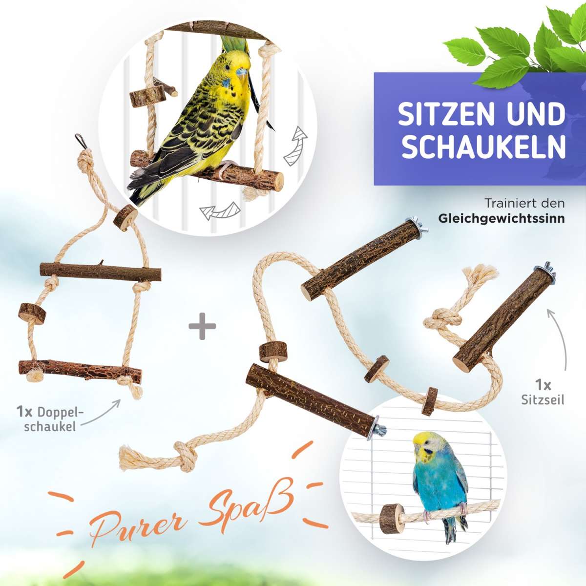 Deine Vögel werden verrückt spielen mit diesem tollen 4-teiligen Set von Vogelgaleria! Enthalten ist alles was das Vogelherz begehrt: Eine Anflugstange für besseres Landen am Käfig, einen kompakten Kokos-Spielplatz mit Naturholz-Sitzstangen und Schaukel (20x20cm, 35cm hoch), die coole Cliffhanger-Schaukel zum Aufhängen (20x20cm, 70cm hoch) und eine Sitzstange mit Saugnapf für glatte Flächen. Alles aus natürlichen Materialien und artgerecht verarbeitet. Perfekt für Wellensittiche, Nymphensittiche und andere Ziervögel. Viel günstiger als die Einzelteile! Deine Vögel können klettern, schaukeln, landen und das Geschehen von oben beobachten. Mach deinen Vögeln eine Freude und verwandle ihr Zimmer in einen Abenteuerspielplatz! Einfach aufstellen und zuschauen wie sie glücklich sind.