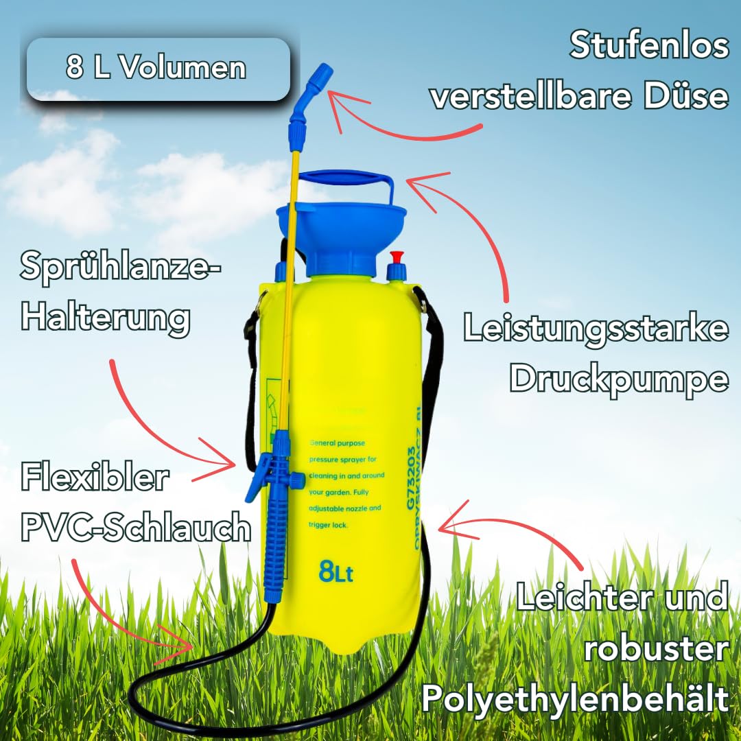 Ob Pflanzenschutz, Düngen oder Schädlingsbekämpfung - mit diesem 8L Drucksprüher meisterst du jede Gartenarbeit! Die verstellbare Düse lässt sich von feinem Nebel bis kräftigem Strahl einstellen. Der praktische Schultergurt und der ergonomische Griff sorgen dafür, dass auch längere Einsätze bequem sind. Hergestellt aus chemikalienbeständigem Material, das ewig hält. Leicht genug zum Tragen, robust genug für den täglichen Einsatz. Perfekt für Blumenbeete, Obstbäume oder sogar die Terrasse. Ein echter Allrounder für jeden Hobbygärtner!