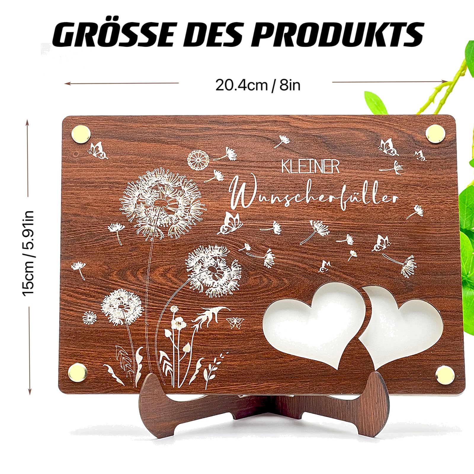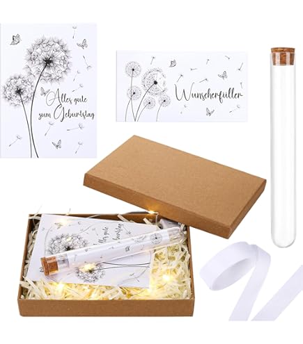 Suchest du nach ner wirklich besonderen Art, Geld zu verschenken? Diese Pusteblumen-Geldverpackung aus Holz ist einfach zauberhaft! Das Pusteblumen-Motiv symbolisiert Hoffnung und Träume - viel schöner als einfach nur nen Umschlag. Im Set enthalten: Die Holzbox (15,6x16,2x3cm), 2 Grußkarten, 2 Kunststoff-Reagenzgläser, Jutesäckchen, Aufkleber und 10m Hanfseil. Einfach die Geldscheine rollen, ins Reagenzglas stecken und in die Holzbox legen - sieht total stylisch aus! Perfekt für Hochzeiten, Konfirmationen, Geburtstage oder Jugendweihe. Die hochwertige Holzverpackung macht was her und die transparenten Röhrchen geben dem Ganzen nen modernen Touch. So wird aus nem einfachen Geldgeschenk ne persönliche und emotionale Aufmerksamkeit. Ob fürs Brautpaar, den Konfirmanden oder Geburtstagskind - damit machst du garantiert eine gute Figur. Einfach, aber wirkungsvoll - genau das richtige für alle, die was Besonderes verschenken wollen!