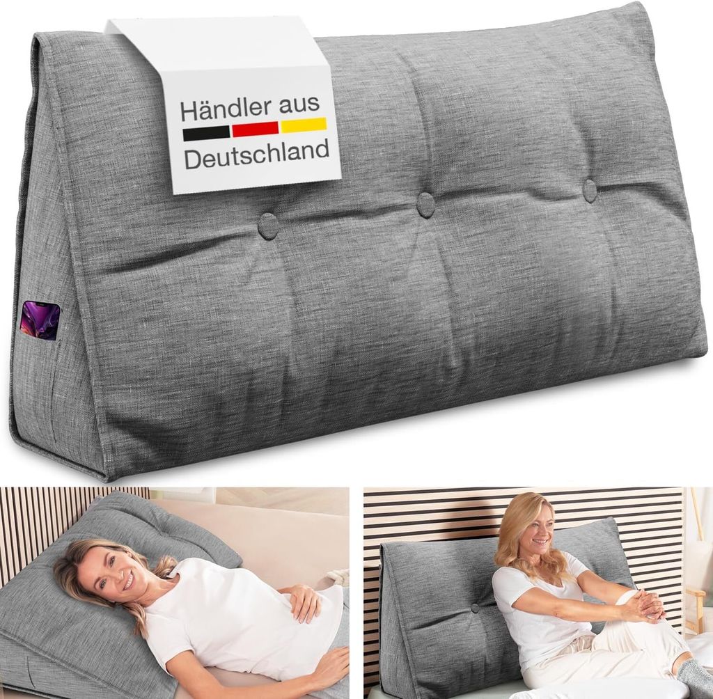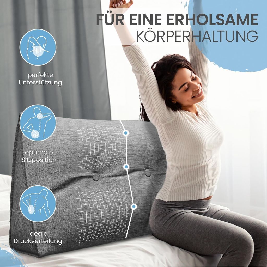 Endlich bequem lesen und entspannen! Dieses großzügige Keilkissen (160x50x20 cm) bietet perfekte Unterstützung für Rücken und Nacken. Ob im Bett, auf dem Sofa oder am Boden - die ergonomische Dreiecksform entlastet deine Wirbelsäure und verbessert deine Sitzhaltung. Gefüllt mit hochdichter PP-Baumwolle, die ihre Form behält und nicht nachgibt. Der abnehmbare Bezug aus Baumwolle-Leinen-Mix ist waschbar und mit einer praktischen Seitentasche für Fernbedienung oder Handy ausgestattet. Perfekt fürs Lesen, Fernsehen, Spielen oder einfach zum Relaxen. In dezentem Dunkelgrau passt es zu jedem Einrichtungsstil.