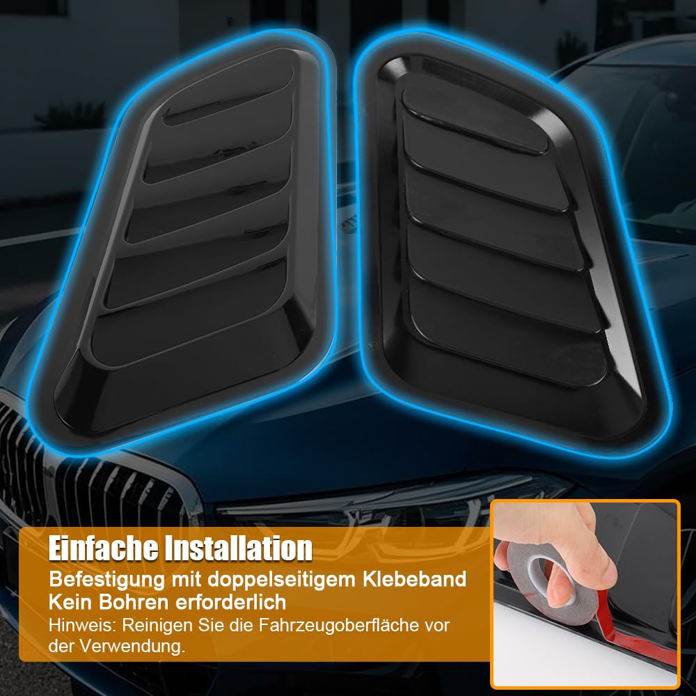 Willst du deinem Auto einen aggressiveren Look verpassen? Diese Motorhauben-Air-Vent-Cover von WODHMIEY sind genau das Richtige! Aus hochwertigem ABS-Material in Kohlefaser-Optik gefertigt, verleihen sie deinem Fahrzeug sofort einen sportlichen und coolen Look. Die starke Selbstklebebeschichtung sorgt für eine feste Haftung ohne lästige Rückstände. Egal bei welchem Wetter - die Folie verliert nicht an Glanz und ist extrem langlebig. Die Installation ist super einfach: Keine zusätzlichen Werkzeuge oder professionelle Hilfe nötig, einfach die Schutzfolie abziehen und auf die gereinigte Motorhaube drücken. Erhältlich in verschiedenen Farben, damit du den perfekten Look für dein Fahrzeug findest. Diese universellen Vent Cover passen für die meisten Fahrzeugmodelle und sind die perfekte Möglichkeit, dein Auto optisch aufzuwerten ohne teure Modifikationen. Einfach anbringen und über die Blicke freuen, die dein aufgepepptes Auto erntet!