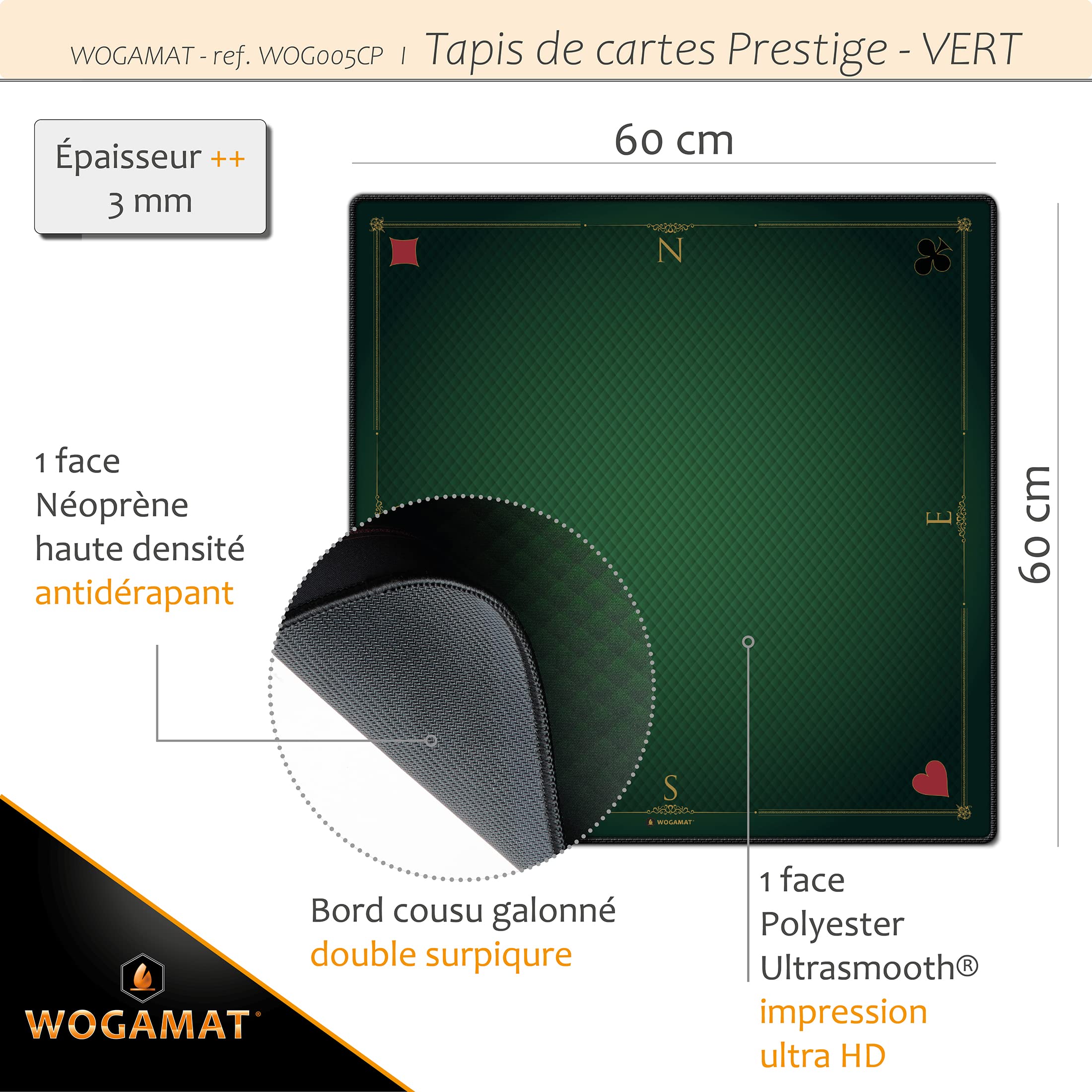 Willst du wie ein Profi Karten spielen? Dann ist diese WOGAMAT Spielkartenmatte genau das Richtige für dich! Das große 60x60 cm Format ist perfekt für Tarot, Poker, Belote und viele andere Kartenspiele. Die rutschfeste Neopren-Unterseite hält auf jeder Oberfläche, während die spezielle Polyester-Oberfläche die Karten perfekt gleiten lässt. Mit gekennzeichneten Ecken für Turniere und den vier Himmelspunkten für professionelles Spiel. Sogar Casinos vertrauen auf WOGAMAT-Qualität! Und wenn mal was daneben geht - einfach von Hand waschen. Mit 30-Tage-Garantie 'Verliebte oder zurückerstattet'. Mach deine Spieleabende noch besser - mit Style und Komfort!
