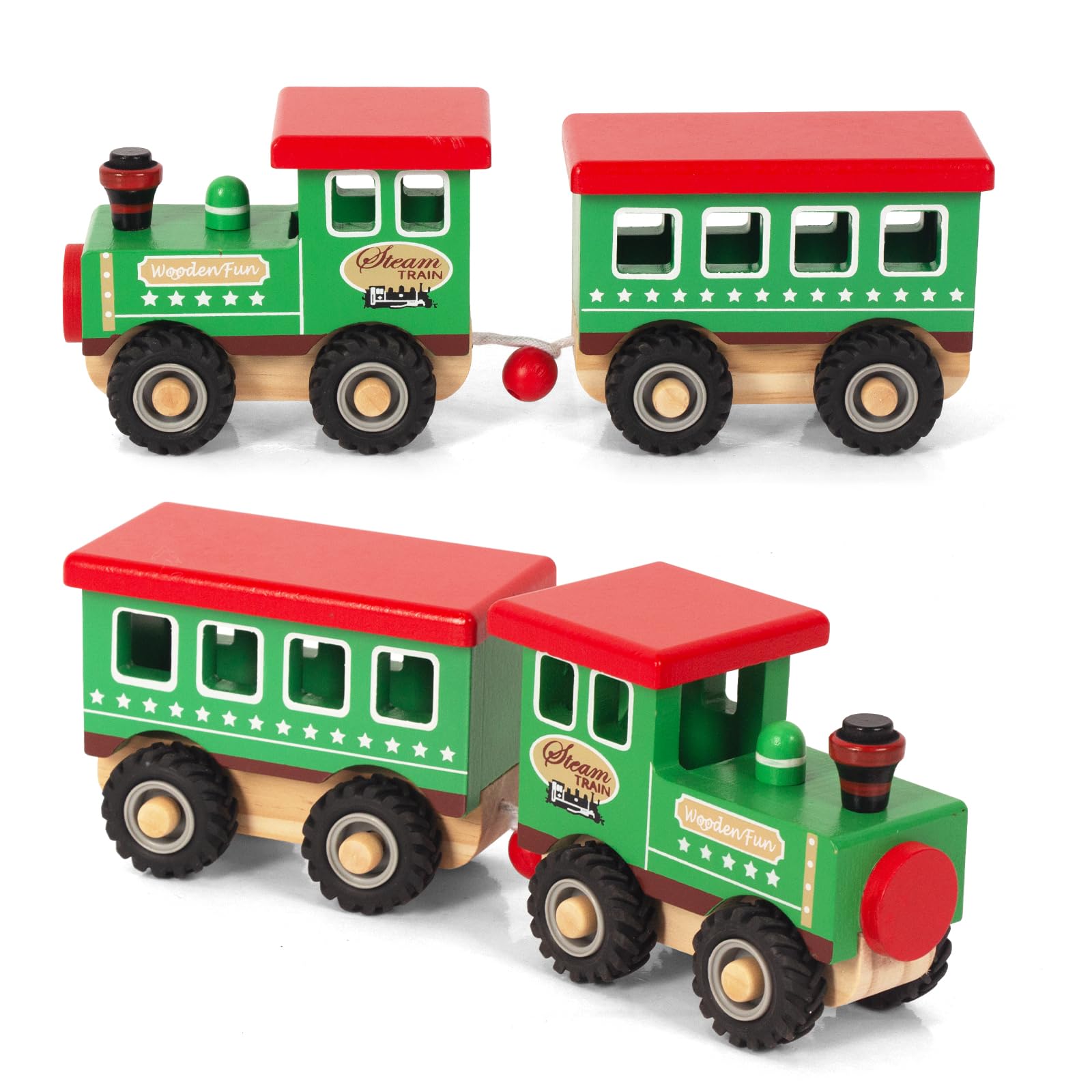 Oh, wie süß! Dieser grüne Holzzug von WOODENFUN ist perfekt für die Kleinen. Mit zwei Waggons zum Zusammenstecken - einfach und kindgerecht. Aus 100% natürlichem Holz mit ungiftiger Wasserfarbe lackiert. Alles handpoliert und absolut griffig - keine scharfen Kanten! Die roten Räder und das grüne Farbschema sind total ansprechend für Kinder. Fördert die motorischen Fähigkeiten, Kreativität und soziales Spielen. Perfekt für Kinder ab 18 Monaten - aber auch größere Kinder haben noch Spaß damit. Als Geschenk zu Weihnachten, Geburtstag oder Ostern einfach ideal. Der retro Dampfzug-Look ist zeitlos schön. Und das Beste: Das Holzspielzeug ist robust und hält auch wildem Spielstand. Ob alleine oder mit Freunden - damit können Kinder stundenlang spielen. Einfach ein klassisches Spielzeug, das in keinem Kinderzimmer fehlen sollte. Und umweltfreundlich ist es auch noch!