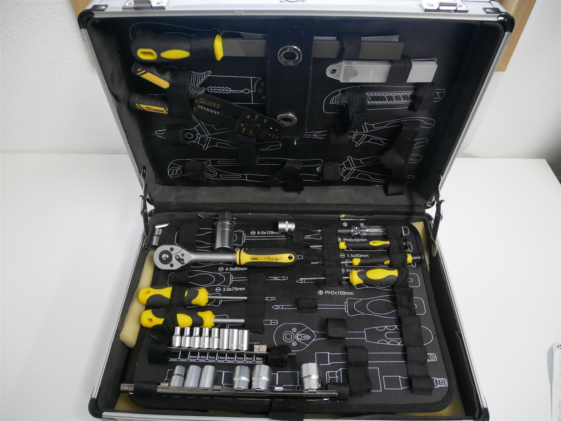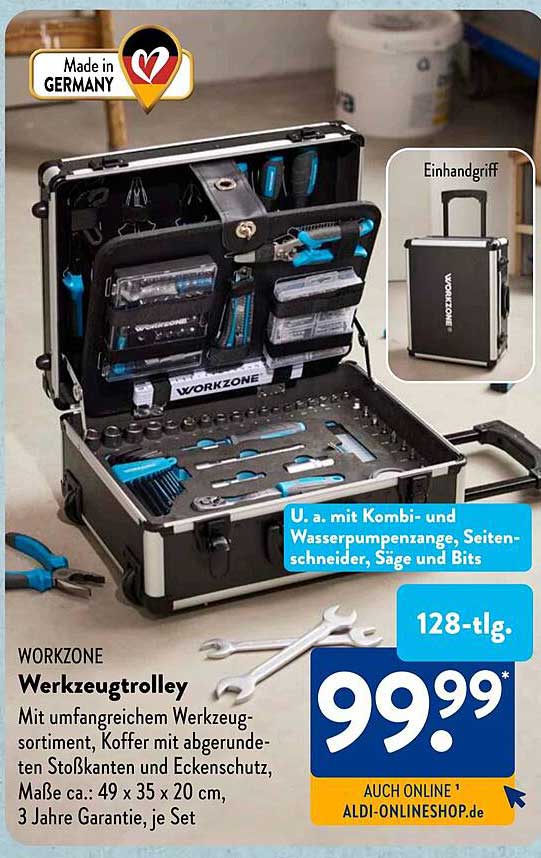Heimwerker, dieser WORKZONE Werkzeugtrolley ist euer neuer bester Freund! Mit 128 hochwertigen Teilen habt ihr für jede Reparatur das richtige Werkzeug parat. Das robuste Aluminiumgehäuse mit abgerundeten Ecken schützt alles sicher. Der ausziehbare Griff und die Räder machen den Transport super einfach - selbst die 9,5kg Gewicht sind kein Problem. Mit 45,5x35,5x19,7cm ist der Koffer kompakt aber geräumig. Enthalten sind eine 72-Zahn-Ratsche, verschiedene Stecknüsse, Schraubendreher, ein 200g Schlosserhammer, Zangen, Bits und sogar Schrauben und Dübel. Zwei abschließbare Klappverschlüsse sorgen für sichere Aufbewahrung. Ob im Haus, Garten oder Werkstatt - dieser mobile Werkzeugtrolley ist immer einsatzbereit. Von der kleinen Reparatur bis zum größeren Projekt - mit diesem Set seid ihr für alles gewappnet!