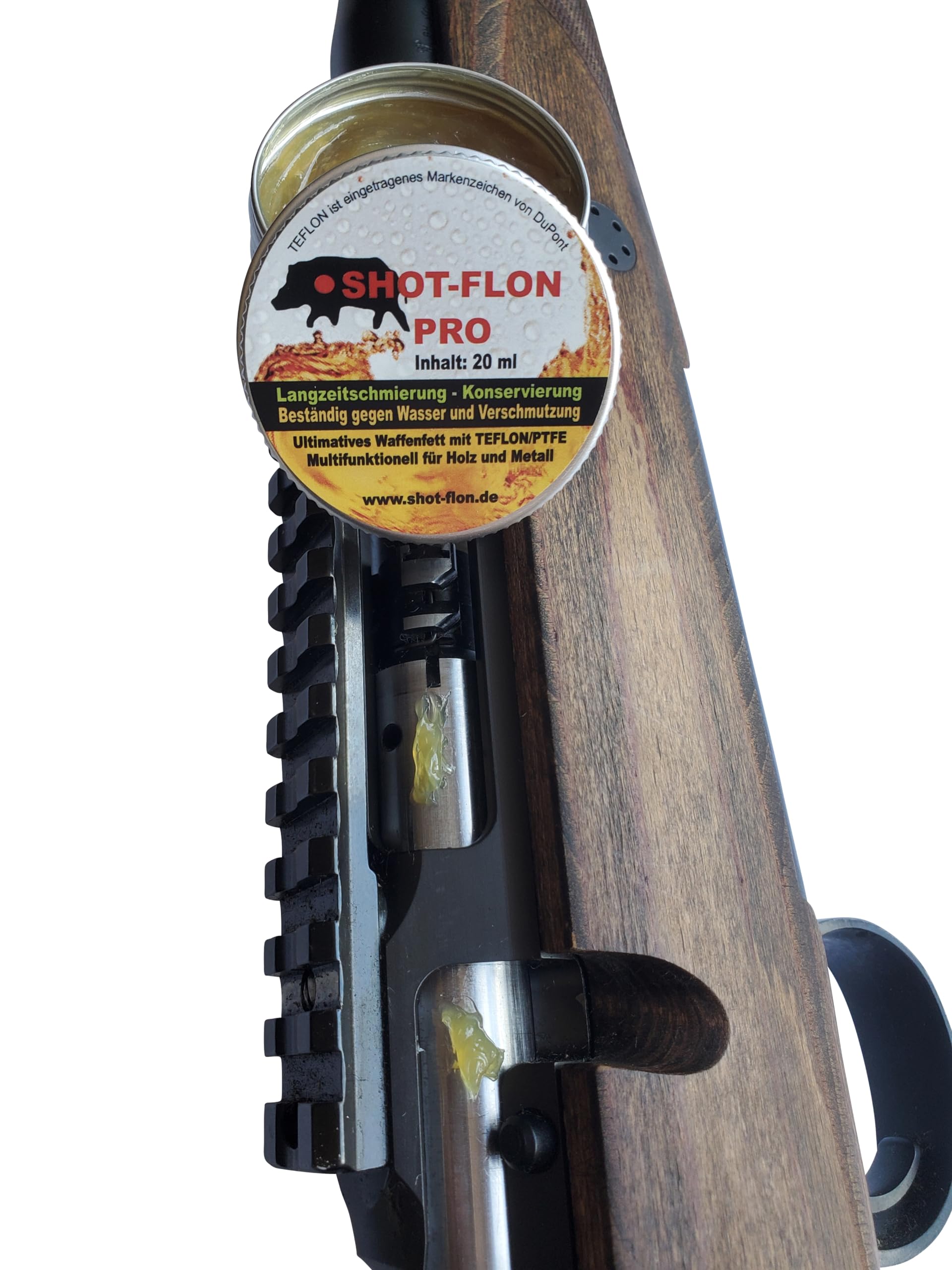 Für alle, die ihre Waffe optimal schützen wollen: Dieses hochwertige Teflon-Waffenfett von LUPUS Professional ist die perfekte Wahl! Es ist speziell für Holz (auch Schaftholz) und Metalle wie den Waffenlauf entwickelt. Das PTFE-Fett bietet extreme Gleiteigenschaften und perfekten Schutz - selbst bei extremsten Bedingungen. Und das Beste: Es ist absolut harz- und säurefrei sowie geruchsneutral. Damit kannst du deine komplette Waffe pflegen, inklusive Innenlauf und Schaft. Sogar im trockenen Zustand versiegelt es deinen Waffenschaft wasserfest. In der 200-Gramm-Packung hast du lange was davon. Einfach auftragen - und deine Waffe ist bestens geschützt!