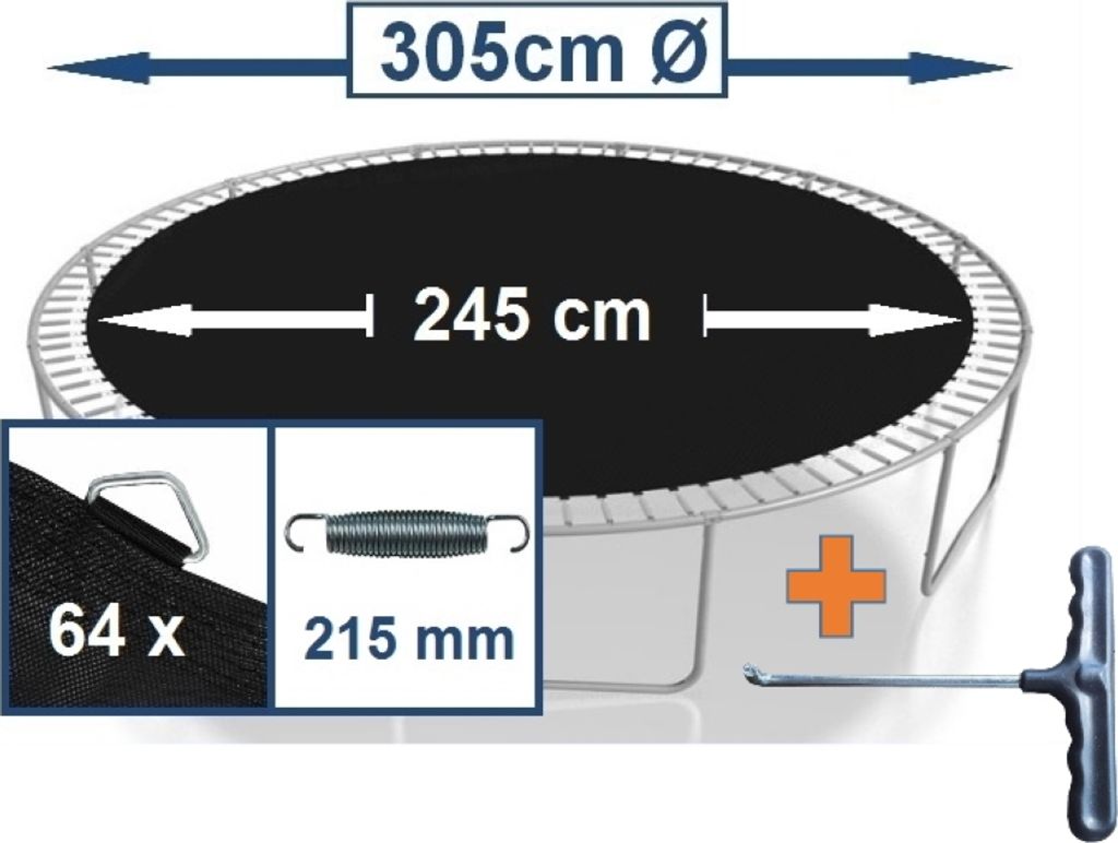 Hey, hast du ein 305 cm Rundtrampolin und brauchst eine neue Sprungmatte? Die walexo Sprungmatte ist genau das Richtige! Sie hat 64 Metallösen und ist super einfach zu montieren. Das Material ist robustes PP-Mesh, das auch bei Sonne und Regen nicht nachgibt. Bis zu 180 kg hält die Matte problemlos aus - ideal für die ganze Familie! Wichtig: Die Federn (21,5 cm) musst du separat bestellen. Ohne Ösen misst das Tuch 245 cm, mit Ösen 250 cm. Perfekt abgestimmt auf Standard-Trampoline mit 305 cm Durchmesser. So macht Springen wieder Spaß!