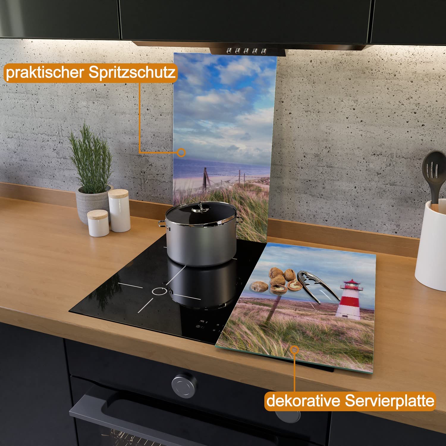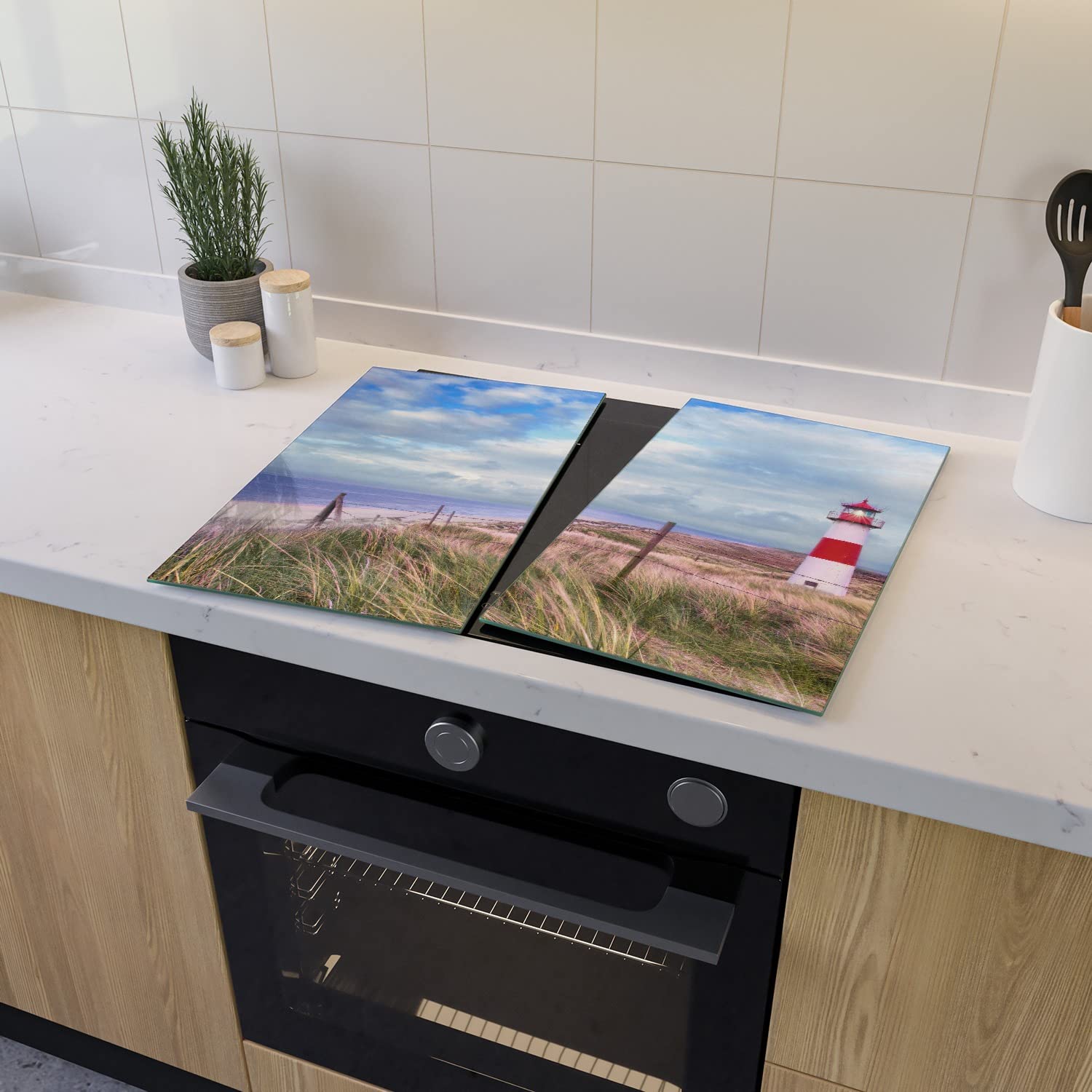 Boah, diese Herdabdeckplatte macht deine Küche sofort gemütlicher! Mit dem tollen 'Am Strand von Sylt' Motiv - Leuchtturm auf der Düne Panorama. Aus robustem 4mm Sicherheitsglas, also bruchresistent und langlebig. 2-teilig, insgesamt 60x52cm groß - passt auf die meisten Ceran- und Induktionsherde. 8mm hohe Gumminoppen sind dabei, damit die Platte nicht rutscht und der Herd nicht zerkratzt. Nicht nur als Abdeckung super, sondern auch als Spritzschutz beim Kochen! Einfach zu reinigen - nur feucht abwischen. Das Motiv ist durch ein Spezialverfahren dauerhaft geschützt. Achtung: Nur auf ausgekühlten Herden verwenden und bei Touchsteuerung vorher prüfen ob's kompatibel ist. Mach deine Küche zu etwas Besonderem - diese Platte ist ein echter Hingucker! Einfach bestellen und deine Küche aufwerten!