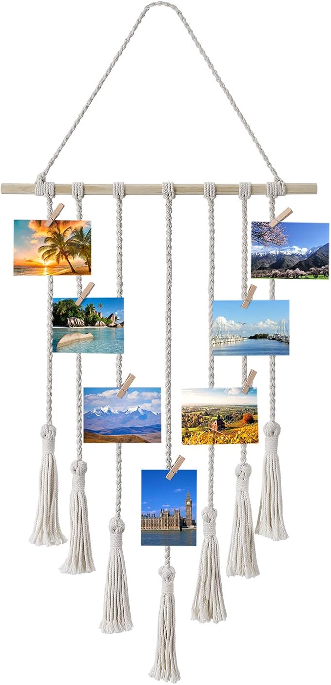 Zeig deine schönsten Erinnerungen im hippen Boho-Style! Dieser wunderschöne Makramee-Fotowandbehang mit 35 beweglichen Holzclips verwandelt deine Wände in eine persönliche Galerie. \\n\\nMaße: 68x40cm - perfekt für jede Wandgröße! \\n\\nIm Lieferumfang: \\n• 35 bewegliche Holzclips für flexible Foto-Anordnung \\n• 5 Papier-Fotorahmen für besondere Akzente \\n• Hochwertige Baumwollfäden in Makramee-Optik \\n• Alles fertig zum Aufhängen \\n\\nSo einfach geht's: \\n1. Wandbehang aufhängen \\n2. Fotos in die Clips stecken \\n3. Immer wieder neu arrangieren \\n\\nPerfekt für: \\n• Schlafzimmer und Wohnzimmer \\n• Studentenwohnheime \\n• Büros und Cafés \\n• Als Geschenk für Liebende \\n\\nDas natürliche Holz und die Baumwollfäden sorgen für eine gemütliche Atmosphäre. Du kannst Fotos, Postkarten, Zeichnungen - einfach alles was dir gefällt - aufhängen und immer wieder neu gestalten. \\n\\nMach deine Wände zu einem Ort der Erinnerungen - bestell dir diesen vielseitigen Wandbehang noch heute!